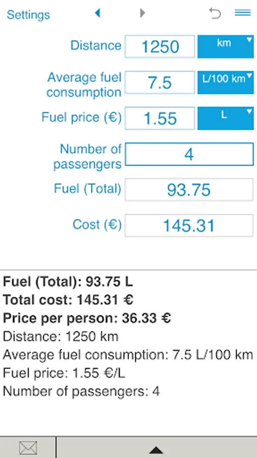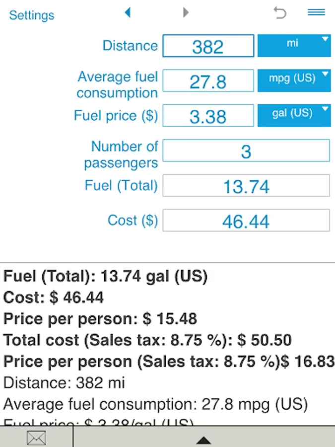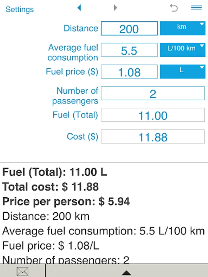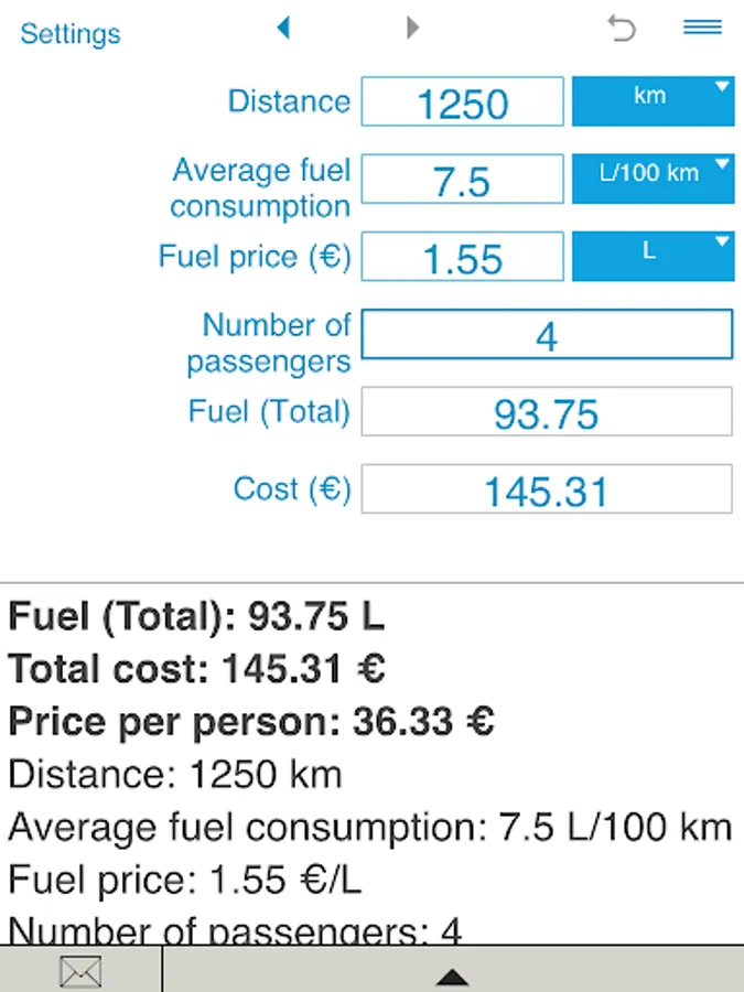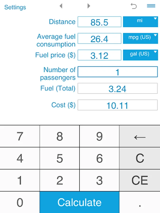 The fuel calculator keeps calculation history so you can easily view and compare your recent calculations.
