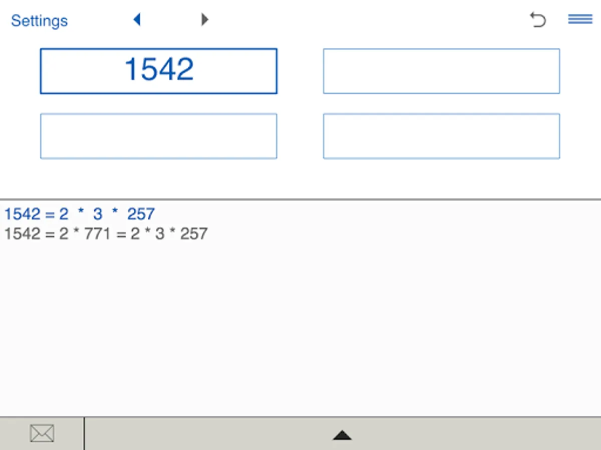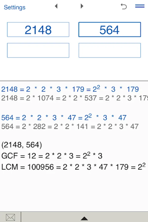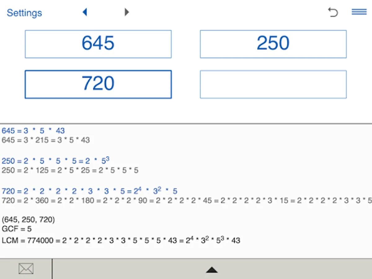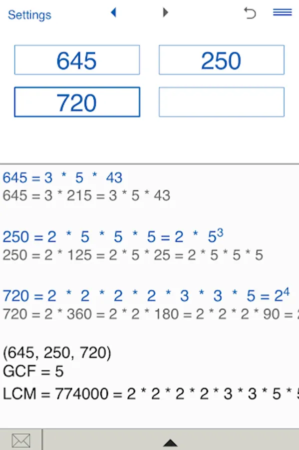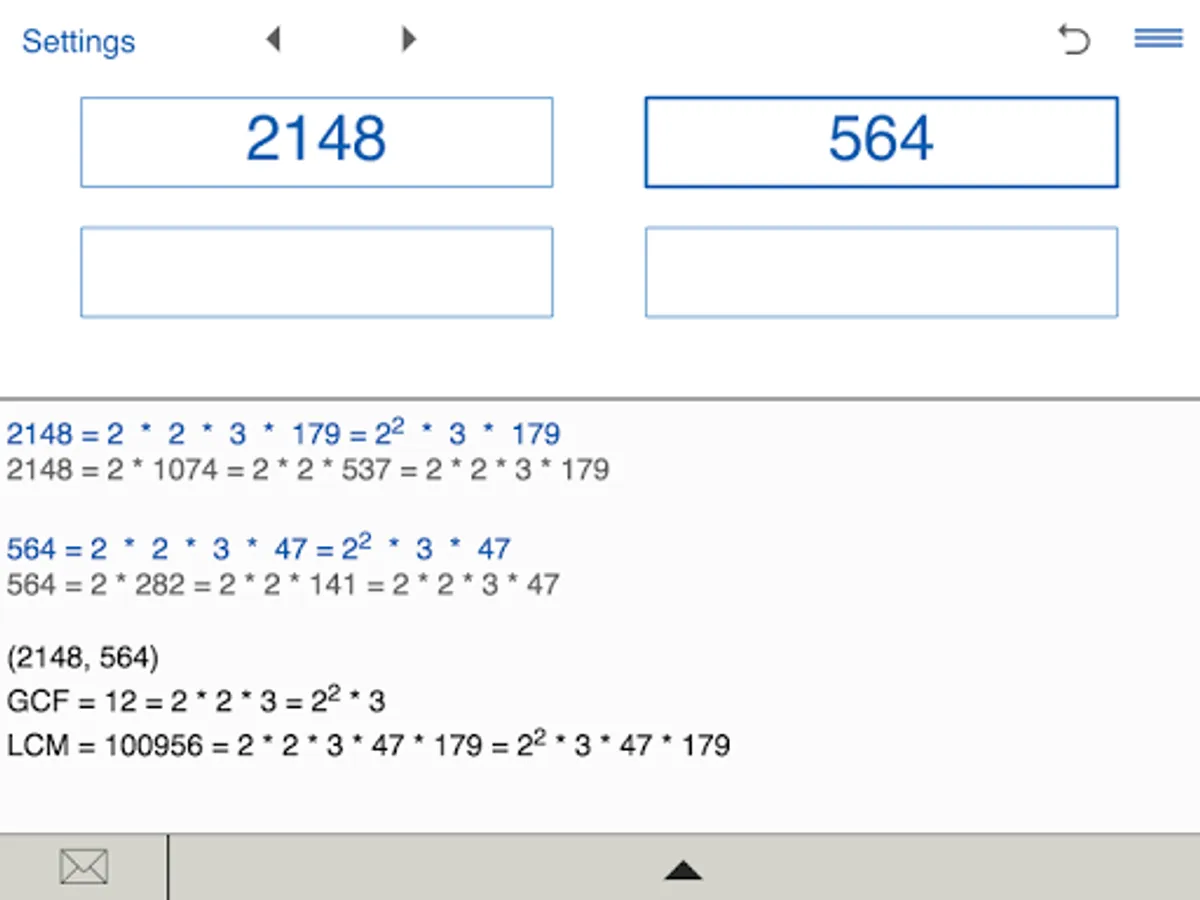 Prime Factor Calculator stores History list. So you can easily view and edit your recent calculations.