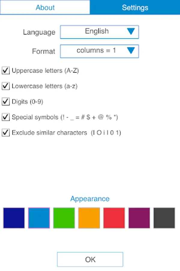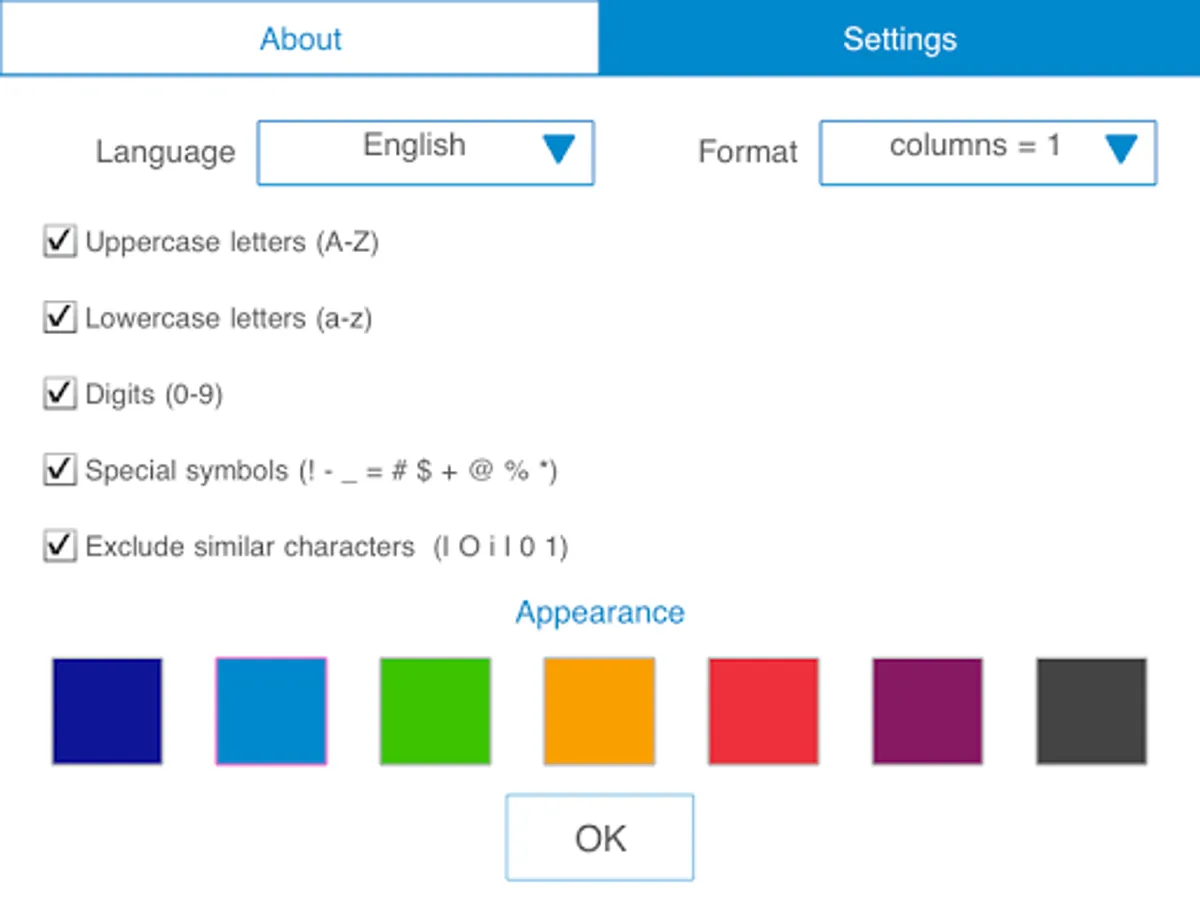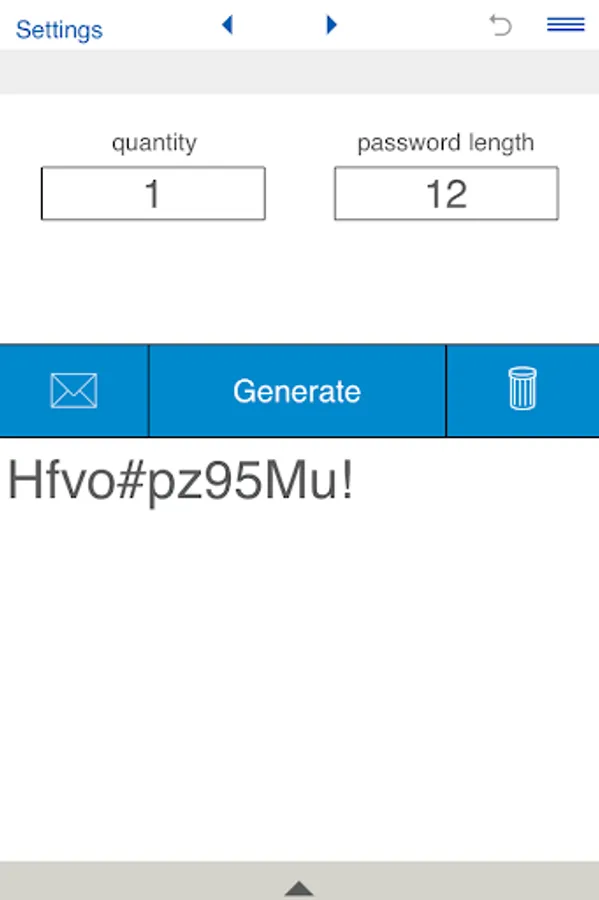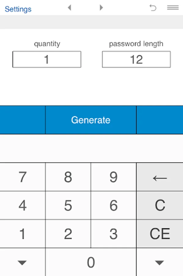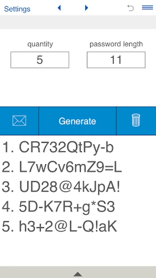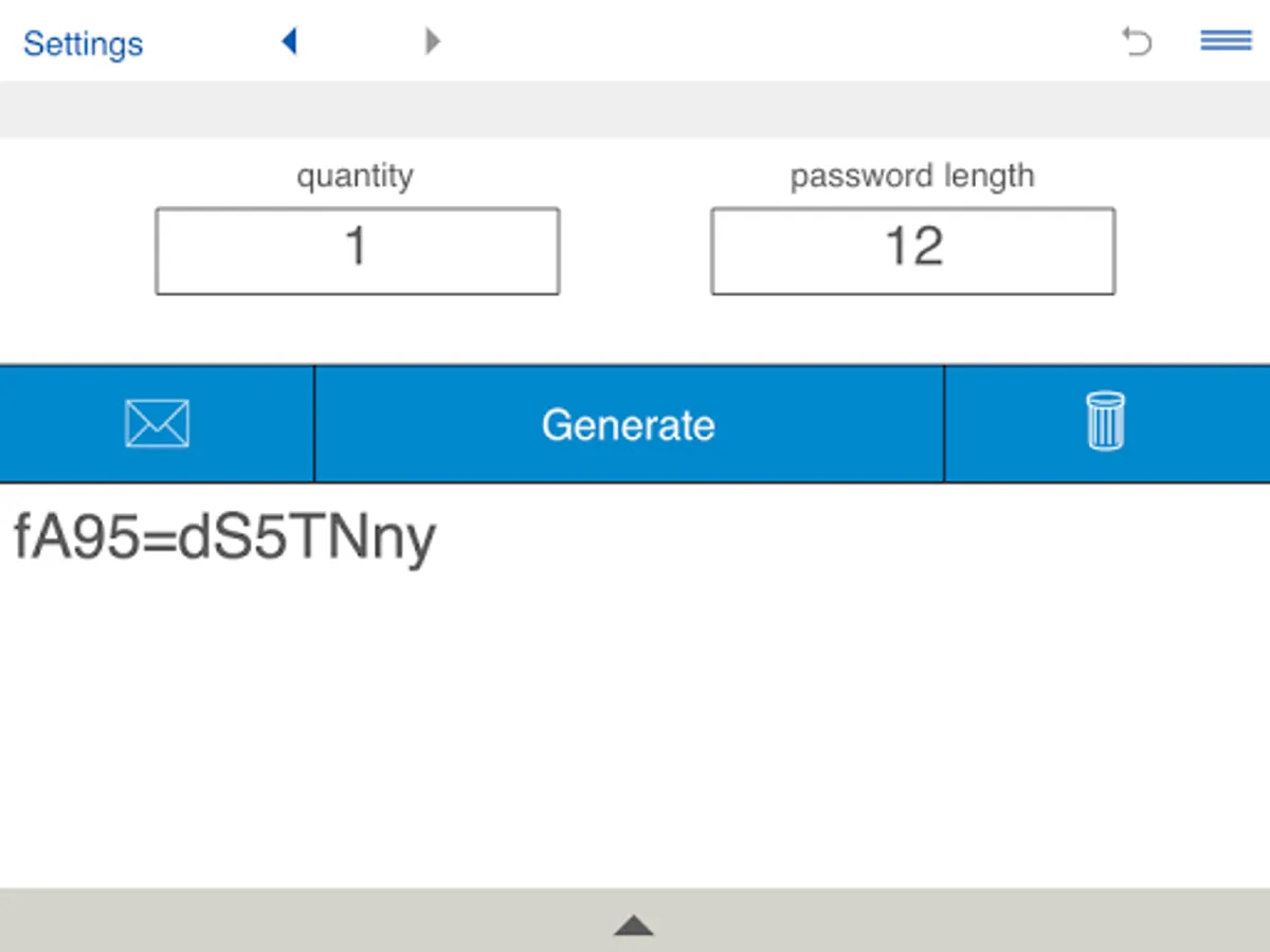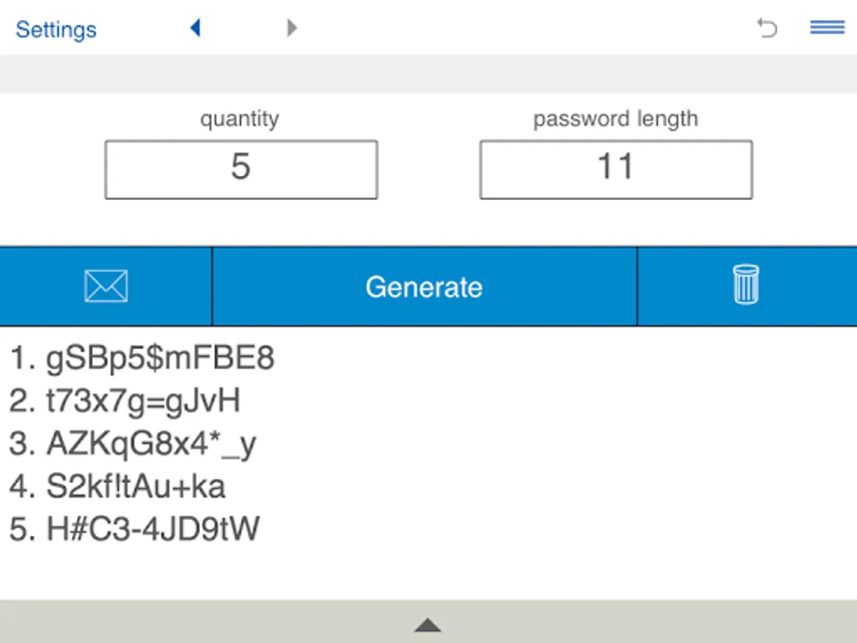 To create random passwords set the password length (up to 100 characters), number of passwords, configure options for the types of characters you want to include and tap Generate.