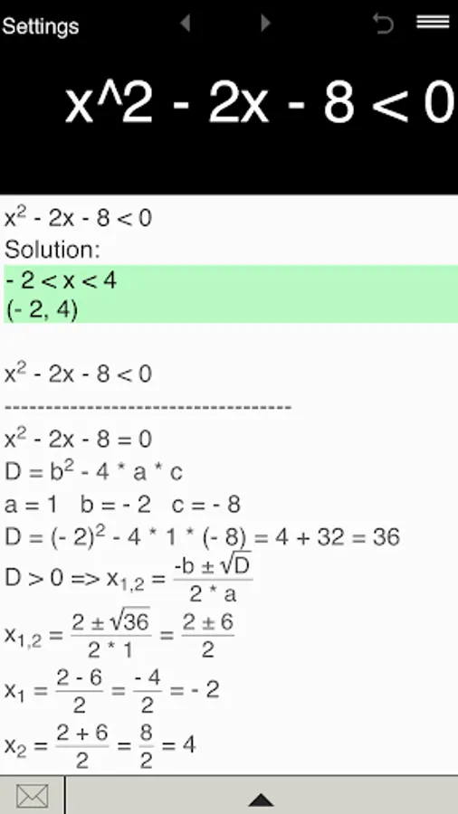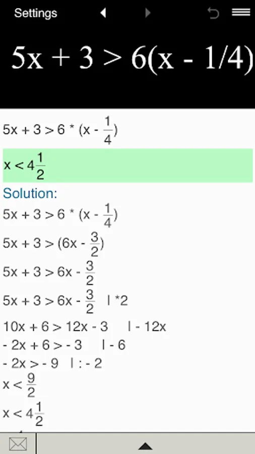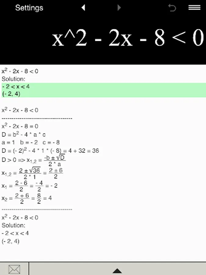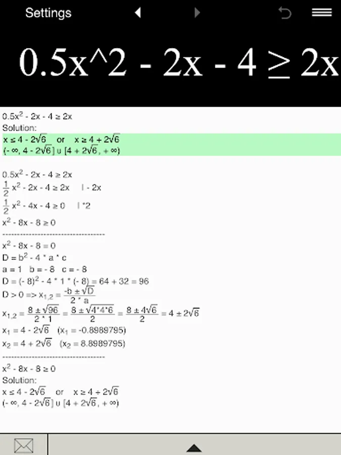 Calculation history (25 inequalities) with the possibility to recall previous inequalities.