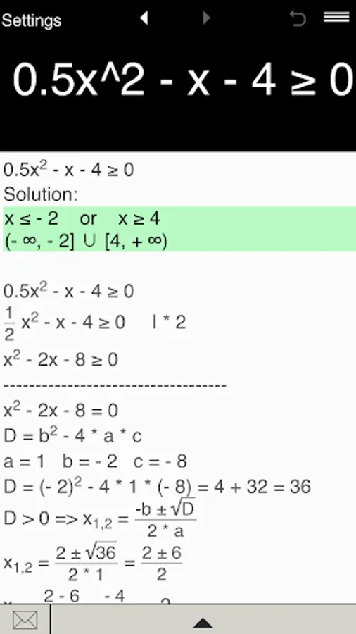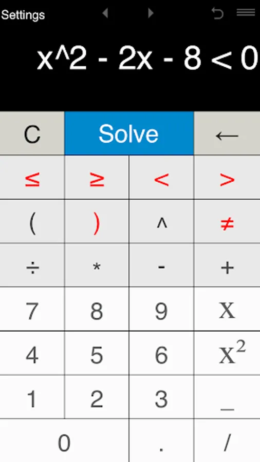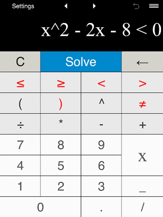 A handy calculator with steps to solve linear and quadratic inequalities.