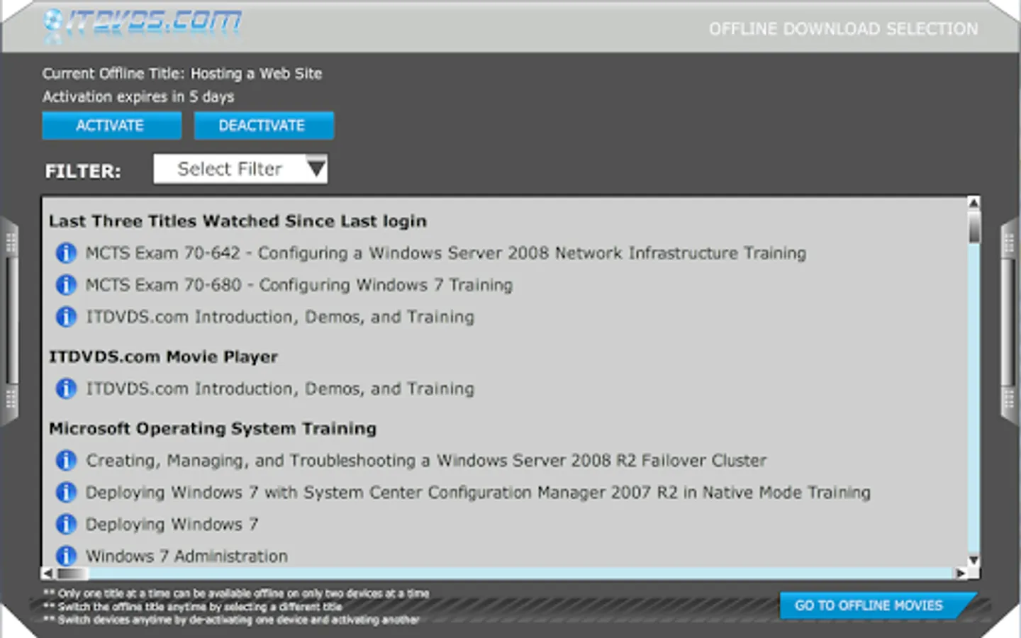 This app is for Premium and LMS members of ITDVDS.com. It allows members to watch one training title offline while they are not connected to the internet. While users are online we suggest using the ITDVDS.com app, which is the Online Movie Player because you get access to all of the other features like practice tests, end of movie quizzes, chapter tests, and flash cards.