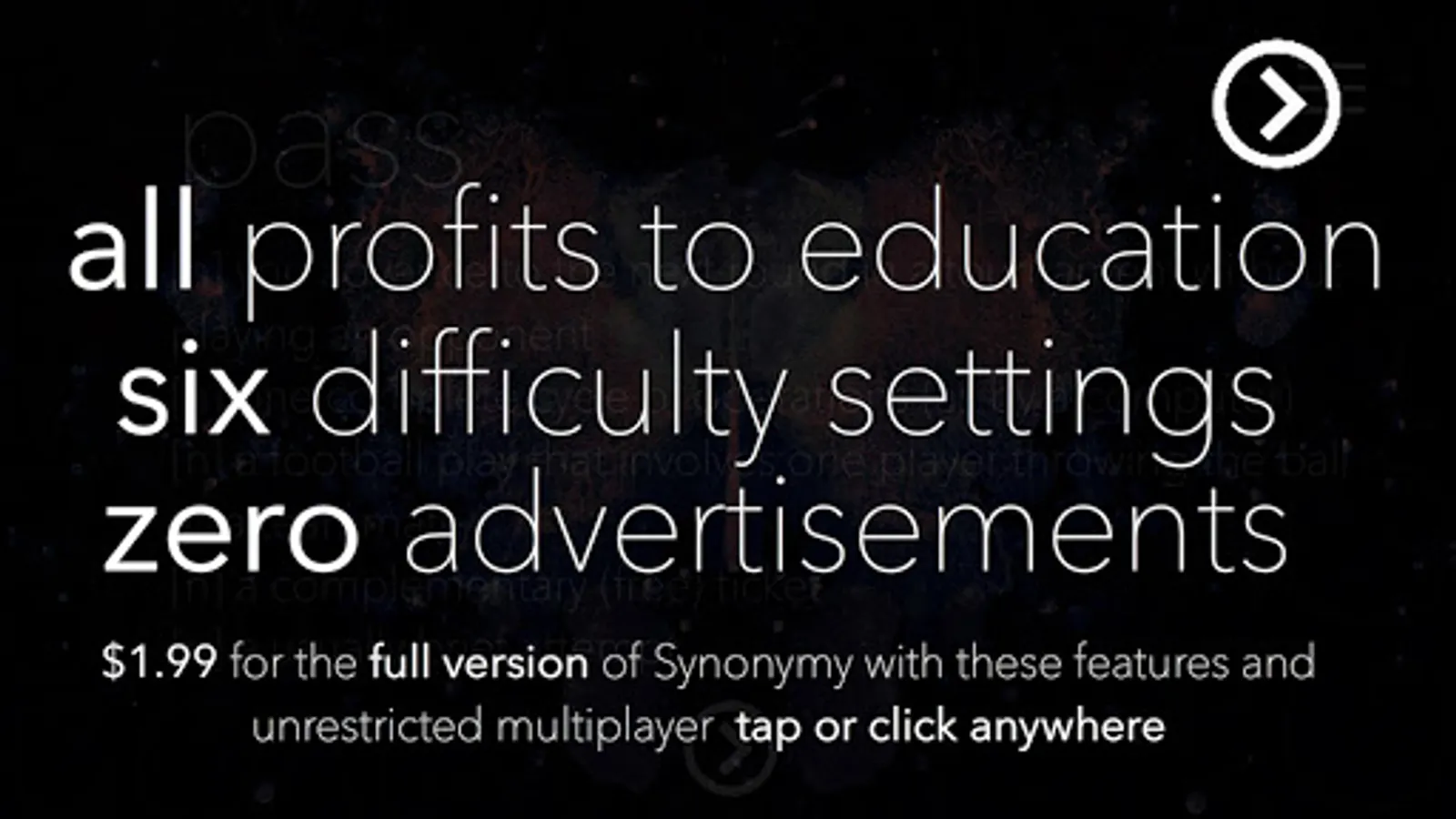 ** Works best using iPhone 5/iPad 2 or later and iOS8. Requires iOS7 or later. The game seems to work on older devices but performance might suffer. Please address any concerns to www.synonymy-game.com/#contact