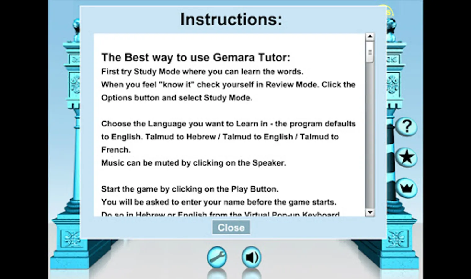 The program teaches words and concepts of Gemara in a way that the student is not forced to remember a long boring list of words. Let the computer handle the boring work, let the student face the challenge. The challenge of playing against the computer encourages the students to outdo the computer. Through this game they end up with a solid foundation of Gemara knowledge that will last a lifetime. The program grades you and corrects your mistakes. It will also keep track of your progress so you can monitor your own improvement. This feature is excellent for teachers and parents and allows you to create incentives for the students. For example, challenge the child to score 10,000 points. Being that the computer keeps track of each student by name and grade, the teacher has a way of verifying and rewarding the students.