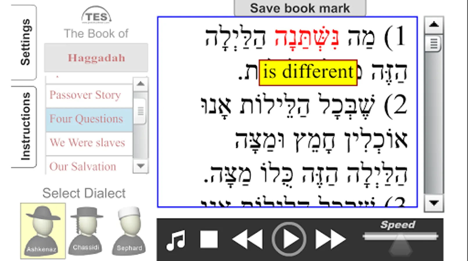 Haggadah Reader teaches the meaning and pronunciation of every Hebrew word in the Haggadah. It teaches one word at a time, at your own pace.