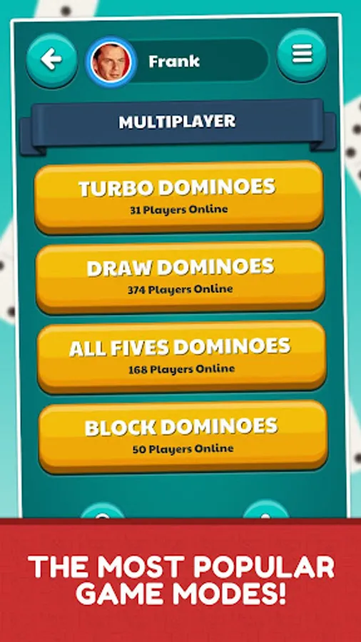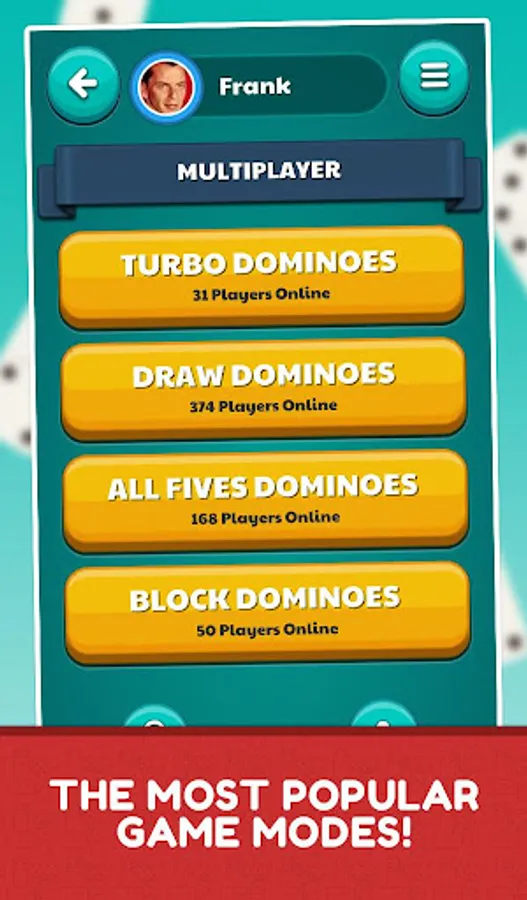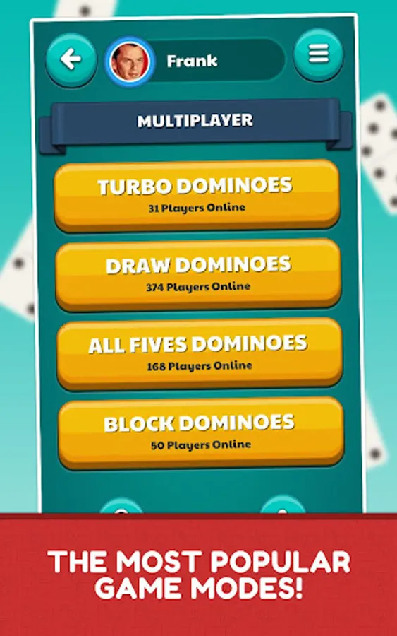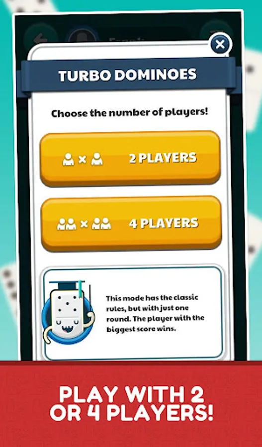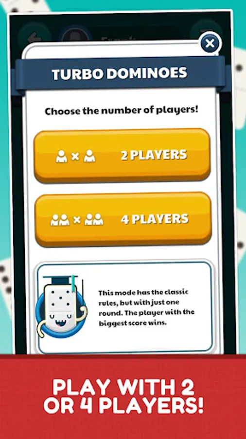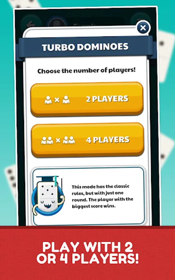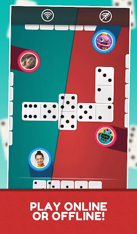 - Dominoes game free with 2 or 4 players in our Multiplayer Online or Singleplayer Offline Modes: Choose if you will create a match with just two players or two teams.