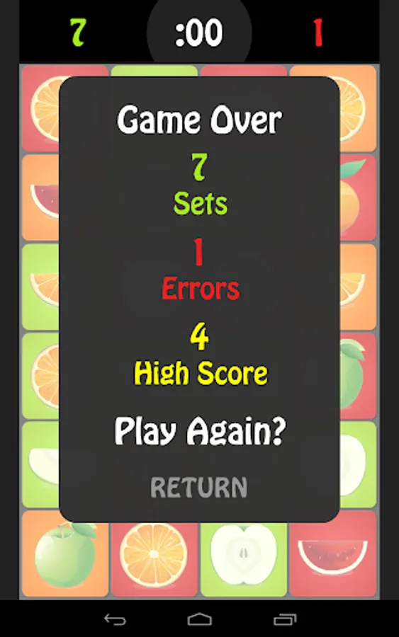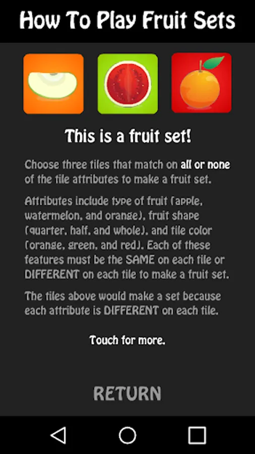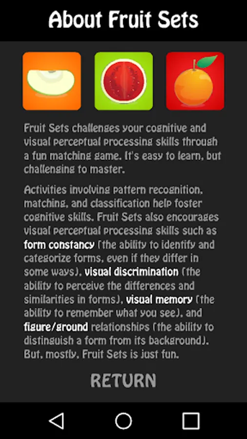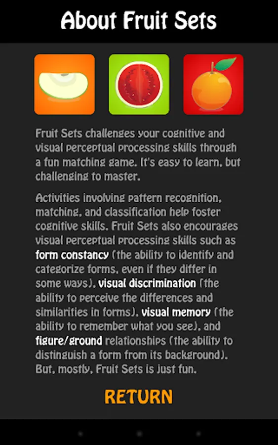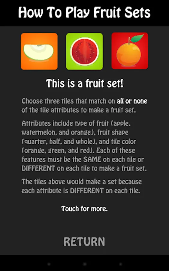 Fruit Sets challenges your cognitive and visual perceptual processing skills through a fun puzzle/matching game for one or two players. It's easy to learn, but challenging to master, and appropriate for both kids and adults.