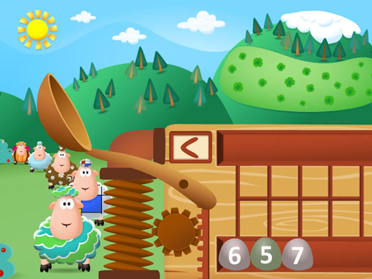 No sheep story would be perfect without a little cattle drive. Here with us the small four-legged friends have built a catapult so they arrive as fast as possible on the hill with fresh grass. The small will intervene because the sheep transport does not work without any knowledge about math! The children will operate with tinkered lines of ascending and descending numbers.