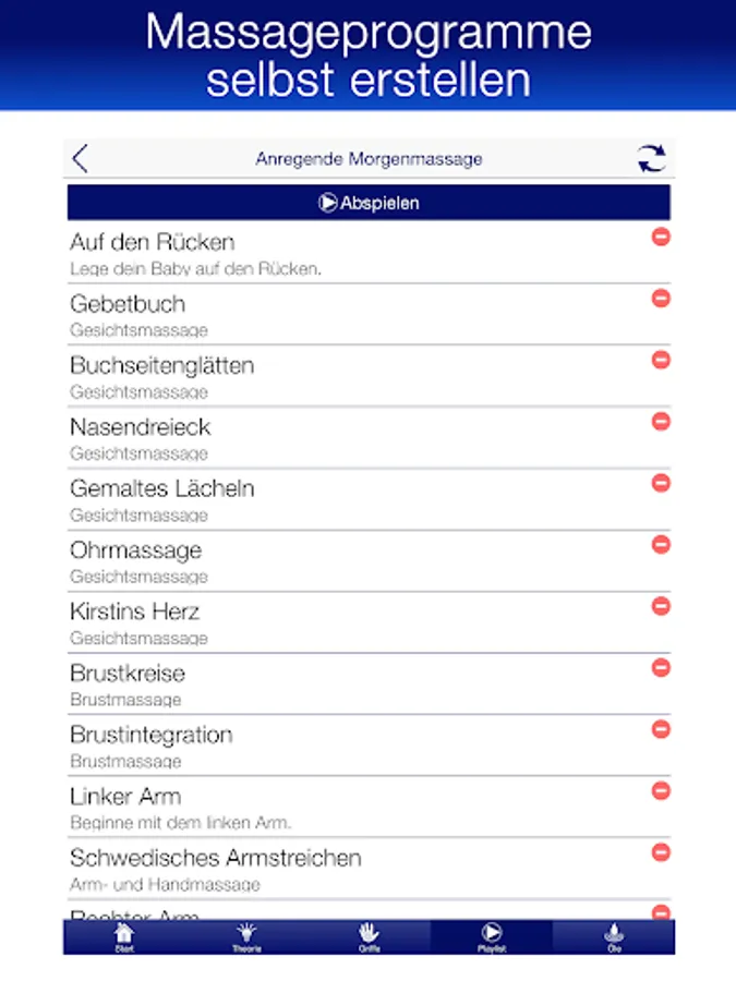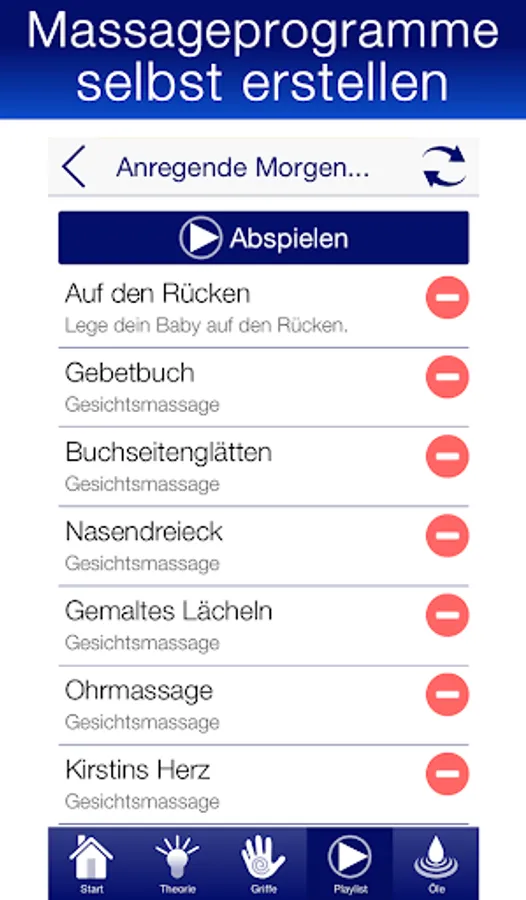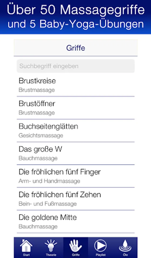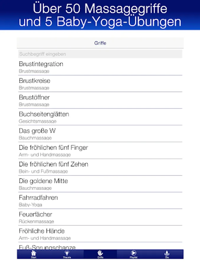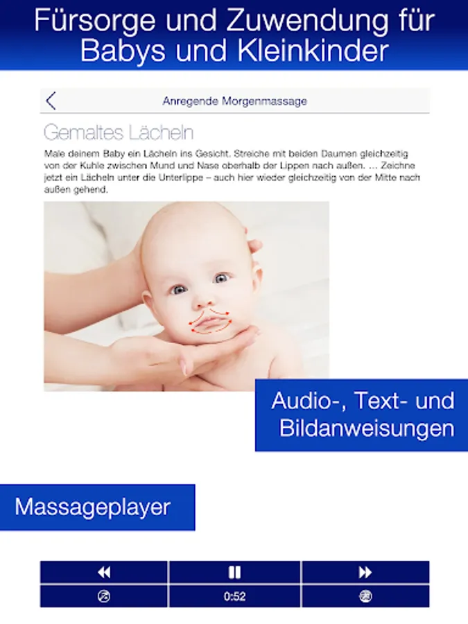 With this app you get a massage innovative player with simple instructions for over 50 different handles the Indo-Swedish Baby massage Leboyer and McClure and the five most important exercises of the baby yoga. The player has all the familiar functions of an audio player and gives you also have the option to define your own massage programs in the form of playlists and play.