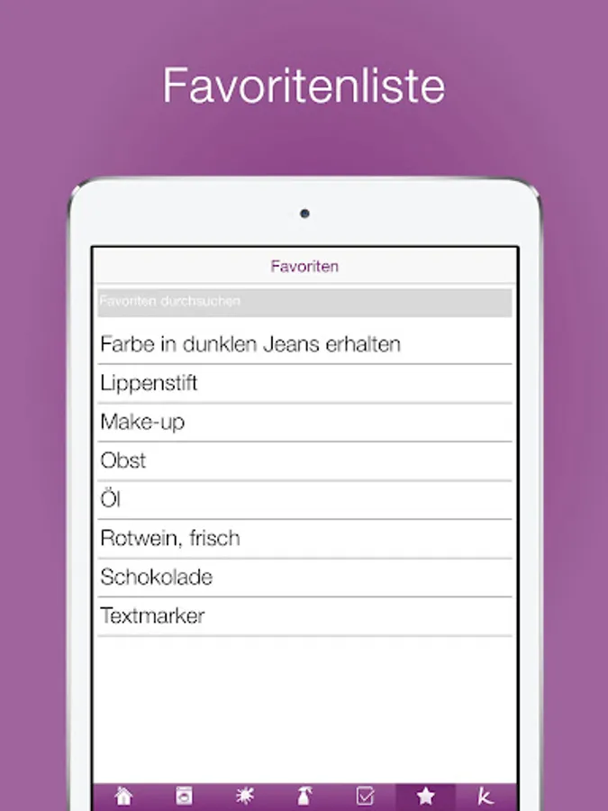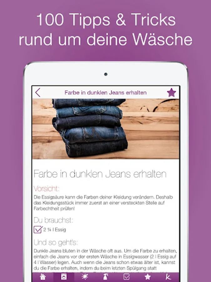 The proven tips are clear and understand with little effort. The alphabetical search feature to kind of stain or active ingredient, an interactive of ingredients / shopping list, practical tips and tricks as well as information on action to show you at a glance, what do you most meisterst which laundry problem.