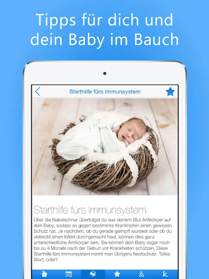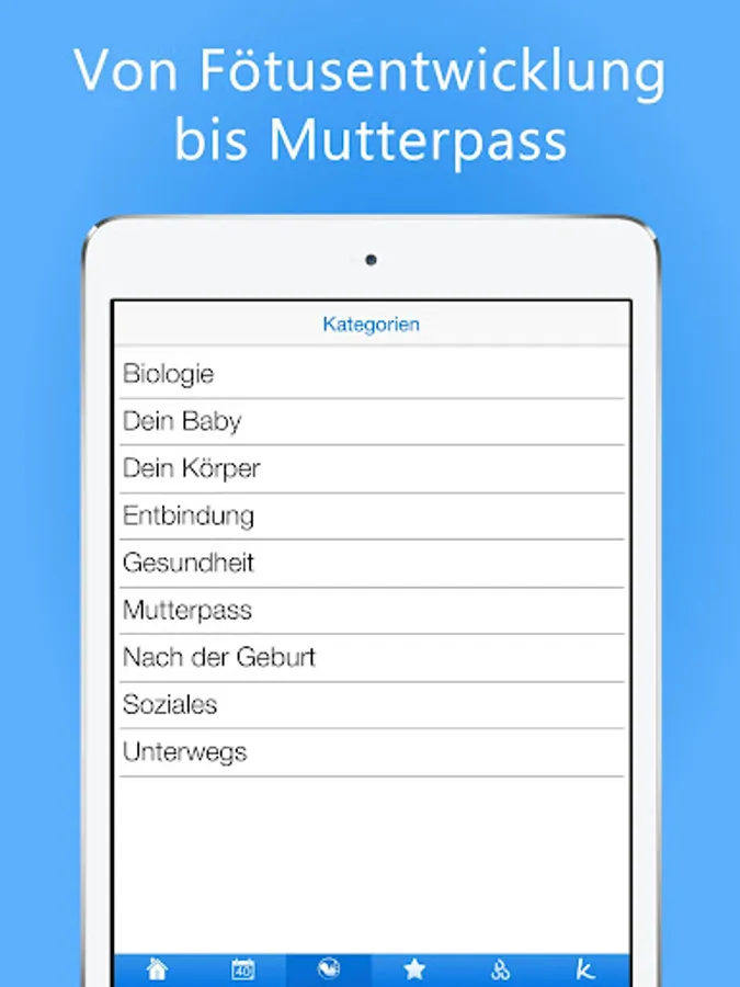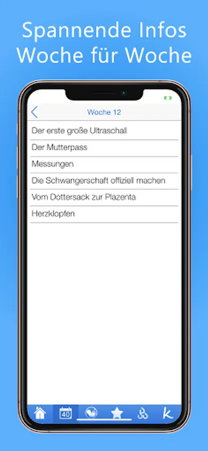 In the Week you will learn the relevant information for you your pregnancy - without any further search. Many items have checkboxes, all of our popular note field for personal items. Fancy yourself, however, comprehensive information on a particular topic, you can do so via the tab categories. From biology to the way we have sorted all the information in eight categories for you here. Some entries that you want to remember for later, either because they do you particularly like, you need it more frequently or they just seem more irrelevant, you can just mark with an asterisk. Then you will find them at a click in your Watch List.