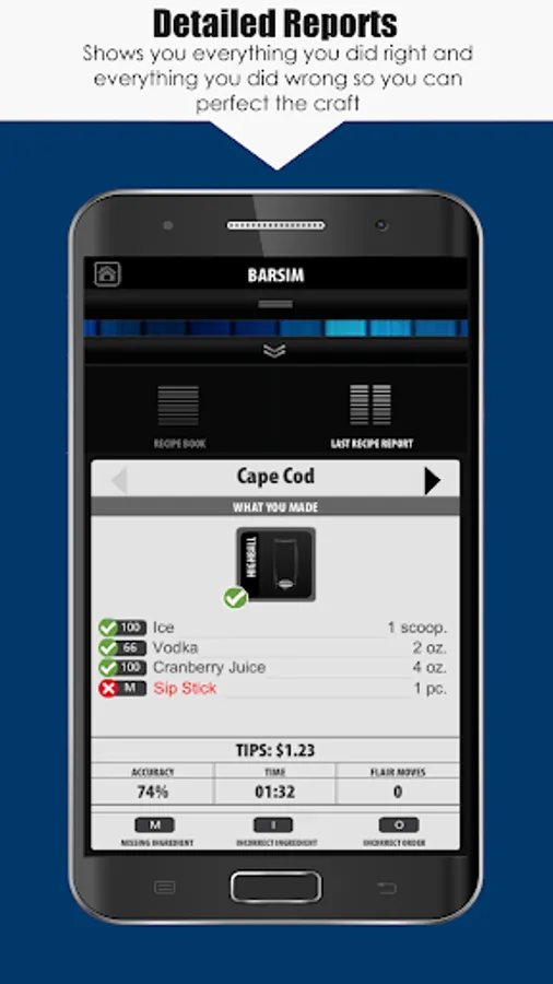 When making Cocktail Recipes in BarSim™ Bartending Simulator every aspect is scored & critiqued, including glassware & ingredients used, amounts poured, proper technique including Shaking, Stirring, Muddling & Blending (including how long you perform the action), as well as proper use of garnishes. You're also timed, so don't spend too much time looking up the recipe if you've forgotten it already. And for the clever few, we've built in a few "secret" flair moves, which will help boost your tip even higher!