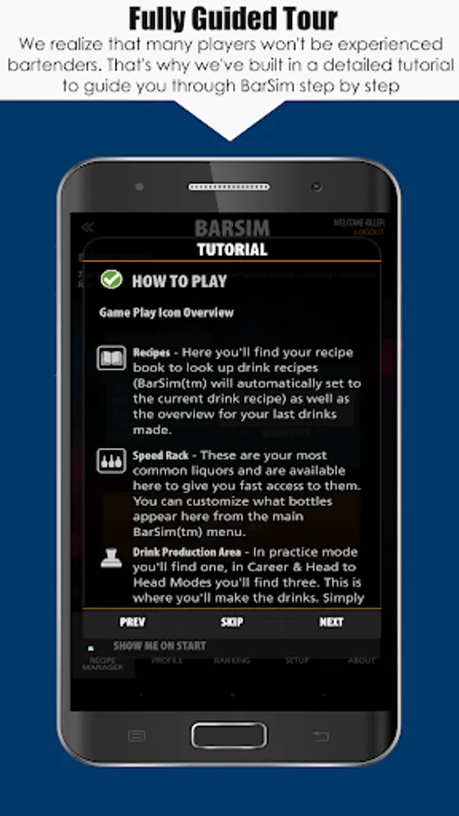 BarSim™ Bartender Simulator utilizes hyper realistic "motion gestures" - the same motions you'd use when making cocktails in real life - so when it's time to pour, you will quite literally pour. When it's time to shake, you will quite literally shake. We've also implemented a fully guided tour explaining everything in fine detail, so you'll be up and playing in no time. Plus with our real time feedback tips during Practice mode, you'll master the fine art of Cocktail Slinging fast!