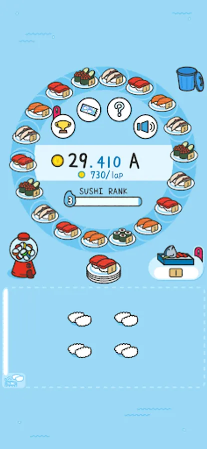 Put your assembled sushi on the conveyor belt and watch it spin around. You'll automatically start earning money!