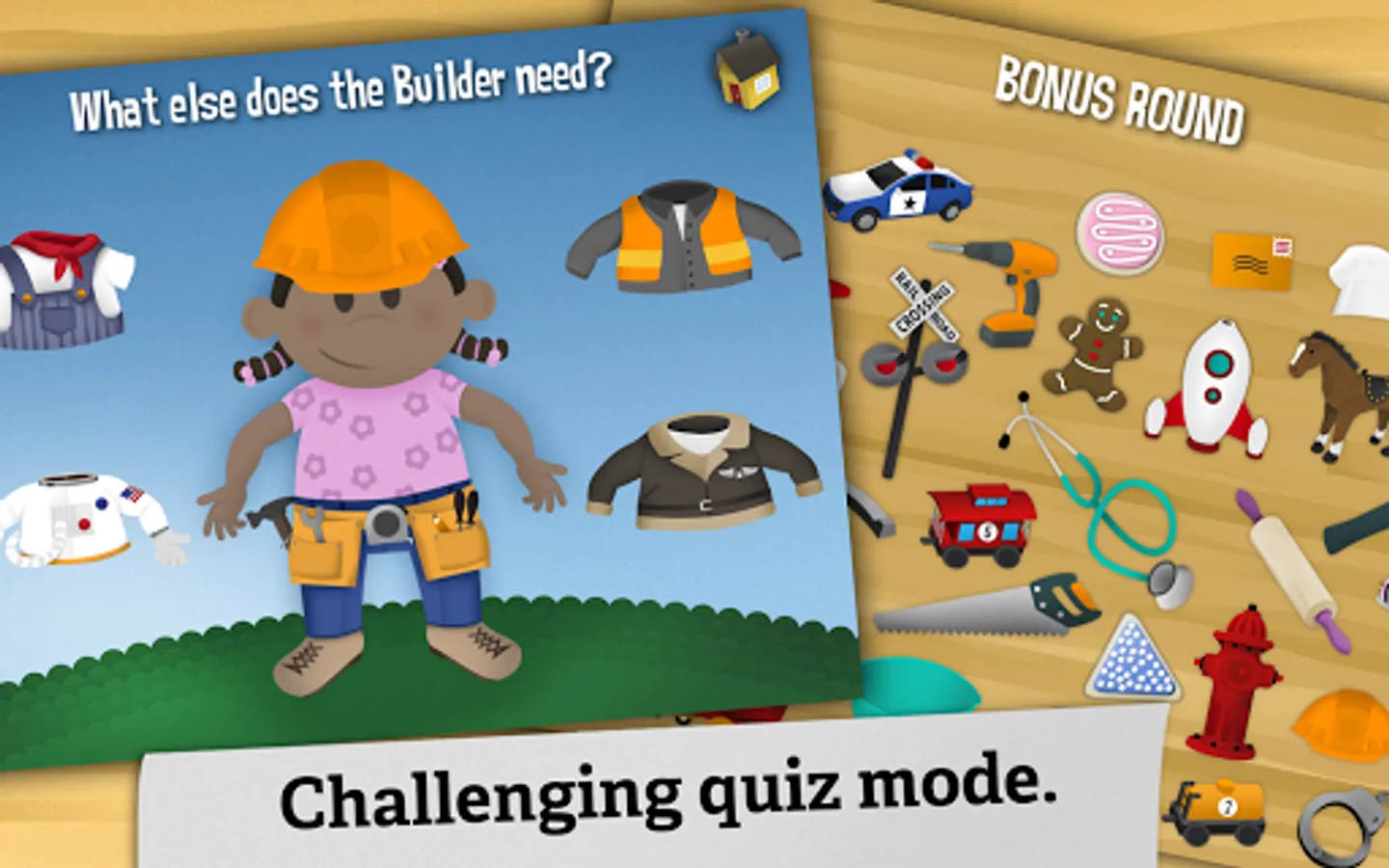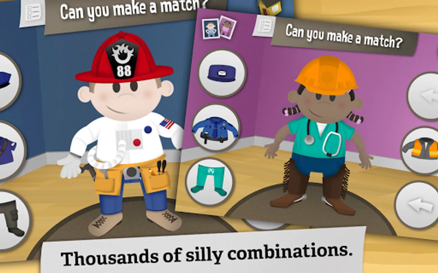 Make hundreds of clever combinations in the awesome dress-up puzzle game with clothes for 10 different jobs. Mix ‘em up for giggles, or make a correct match to unlock adventures that will have your kids wrangling cattle, flying rockets and grinning from ear to ear. Fun for boys and girls, Swapsies Jobs offers a great way for toddlers to explore the working world.