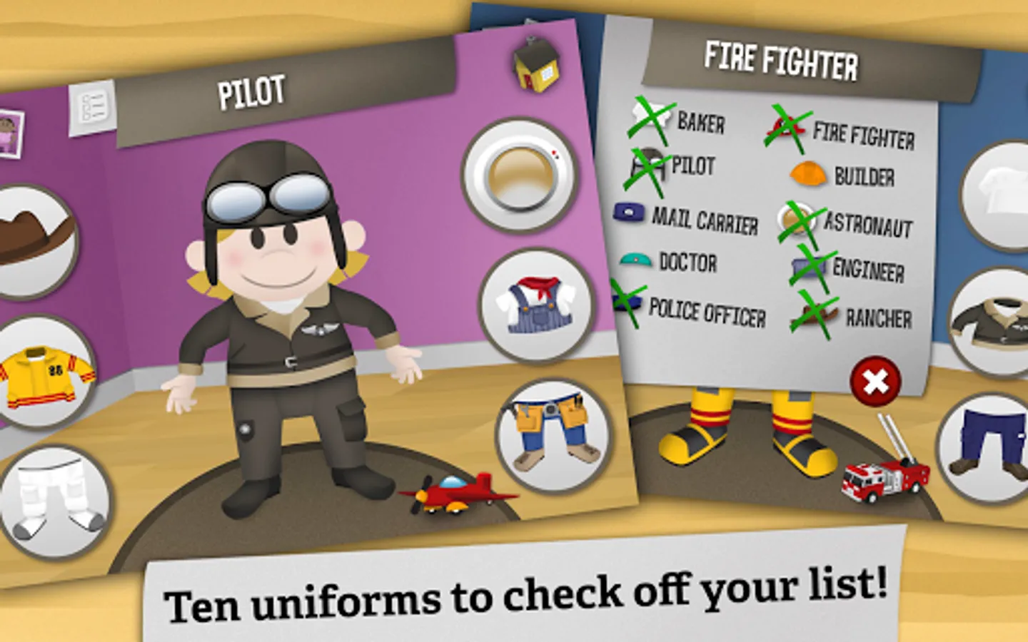 • The clothes to make a baker, pilot, mail carrier, doctor, police officer, firefighter, builder, astronaut, engineer, rancher and hundreds of fun combinations.