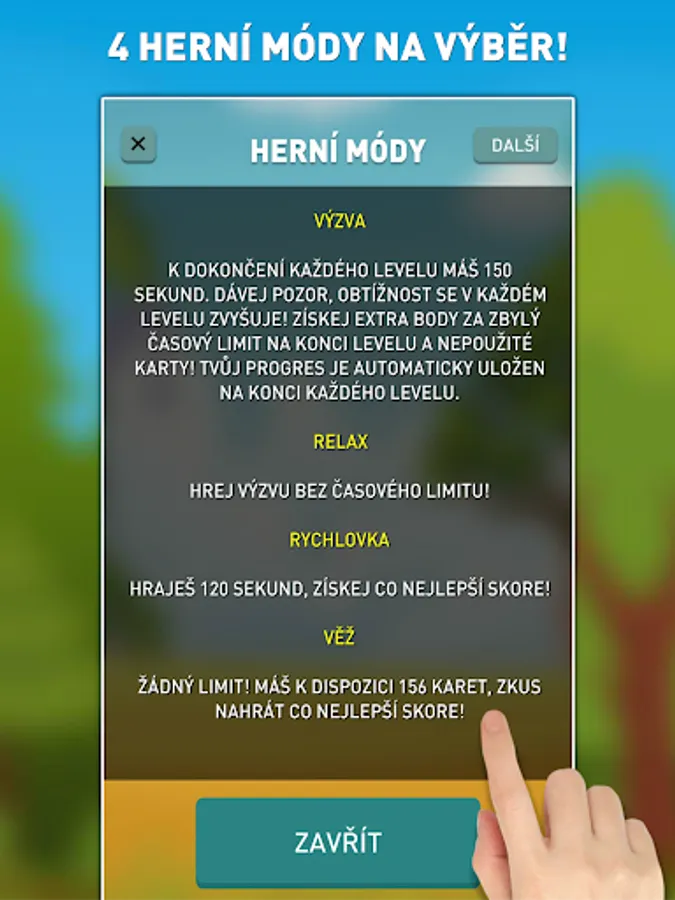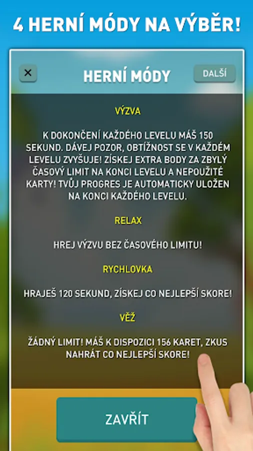 * Challenge - You have 150 seconds to complete each level. Be careful, the difficulty increases with each level! Get extra points for remaining time limit at the end of the level and unused cards! Your progress is automatically saved at the end of each level.
