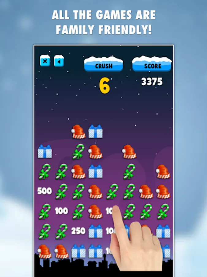* Chains - remove at least 5 Christmas symbols of the same kind to get the new symbols to play with and try to get the best score possible!
