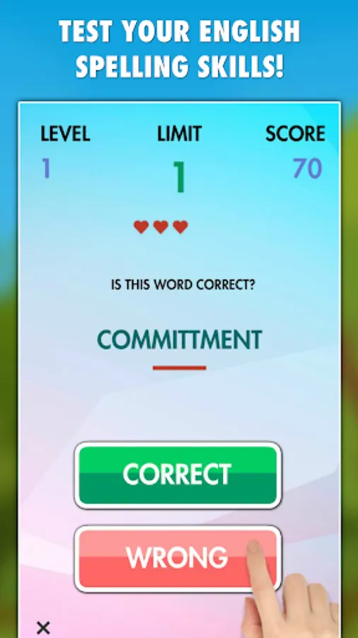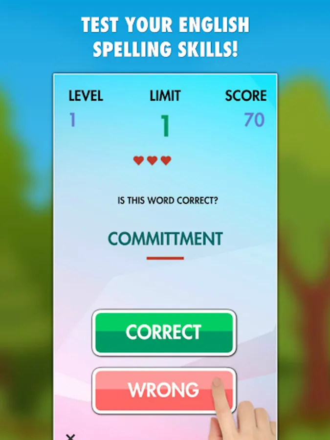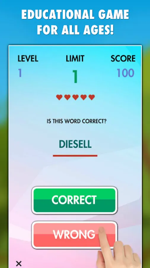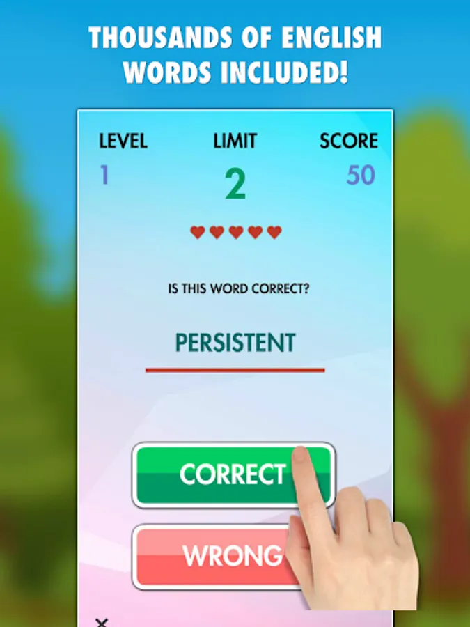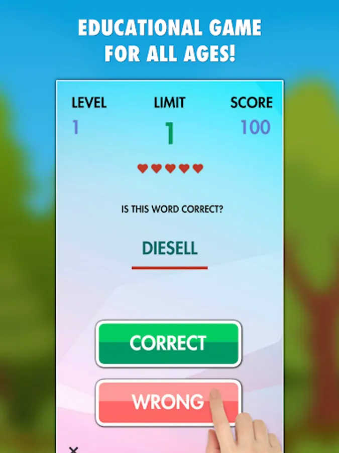 There will be shown a word on the screen and your task is to decide if the word is spelled correctly or not! Answer correctly given number of words in order to progress to the next level! Watch out, you can make max 5 mistakes in each level. Also watch out for time limit shown under the word. If you lose the level, you can play it again (max three times) from the level you failed, otherwise you will have to start from level 1.
