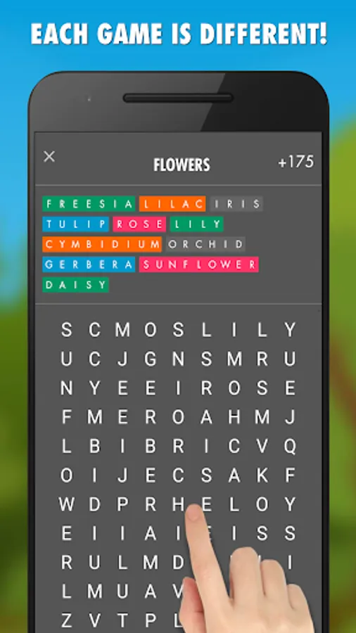 Try to find all the words in all 800 predefined levels or play an unlimited "Mixed words" mode in which you play with random words and each game is different!