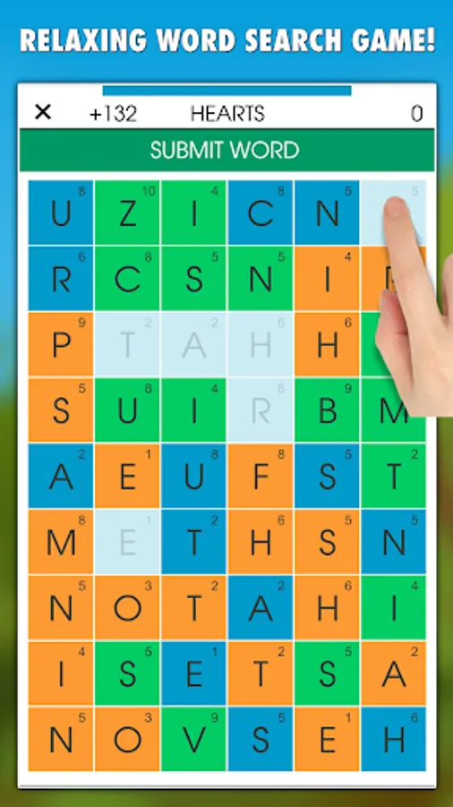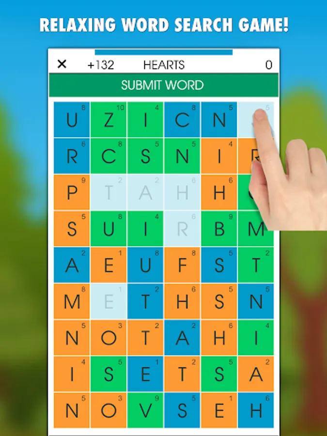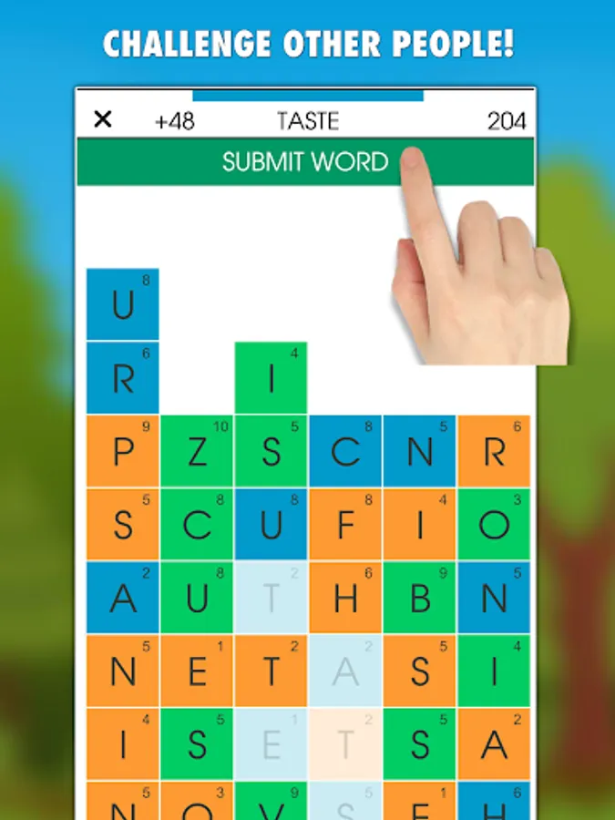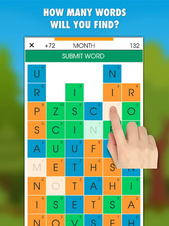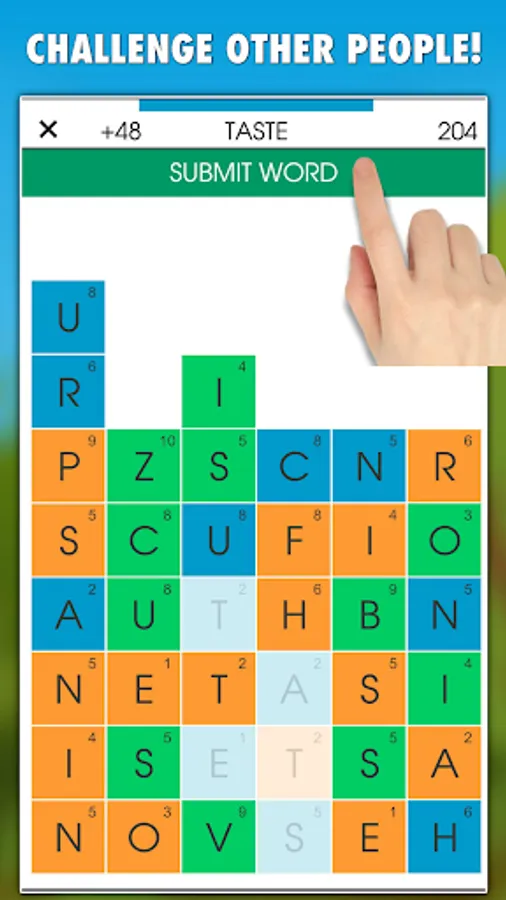 There will be shown 54 letters on the screen - tap on them to create words with 3-10 letters! Each letter has its own points and color, try to match the color of the first letter in your word to get extra points! There will be shown a SUBMIT WORD button if the word exists, press it to submit the word and to receive the points! To erase the word just tap on any already selected letters! To erase the last letter only, just tap on your created word at the top of the screen. You can submit your score whenever you want by pressing the X button in the top left corner. Get the best score possible!