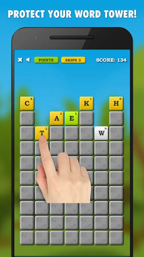 * Tap on letters in order to create English words. Each word must have 3-7 letters. Match colors of the first letter in your word to protect your tower, otherwise the tower will be damaged!
