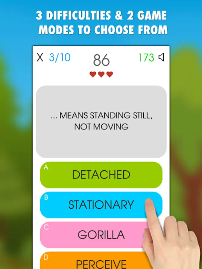 There are 2 game modes to choose from - "Explain word" or "Assign a definition". There are 4 options, choose the correct one, just one option is right! Your score depends on your speed. Get the best score possible in 10 rounds or 120 seconds time limit. Watch out, you can make max 3 mistakes otherwise your game ends.