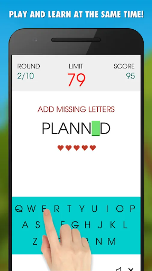 2. Then the same word appears but with missing letters (number of missing letters depends on difficulty you choose), fill all the empty gaps in the word displayed by using the keyboard provided.
