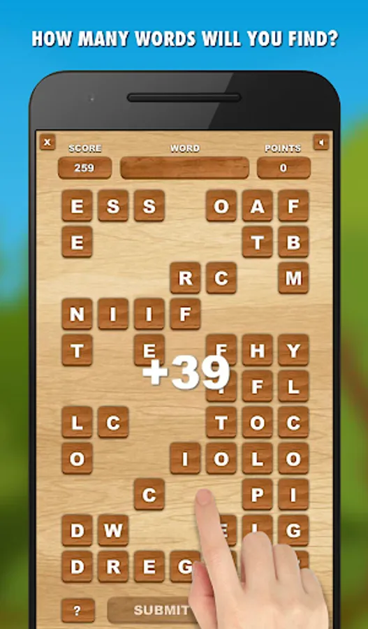 Move you finger over the letters on the board to highlight a group of 9 letters you will play with! With the group selected create as any words as you can! The game recognizes if the word exists, if so, there will be shown a submit button, press it to submit your word!