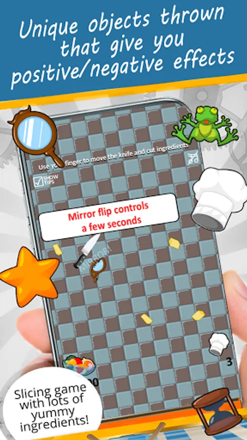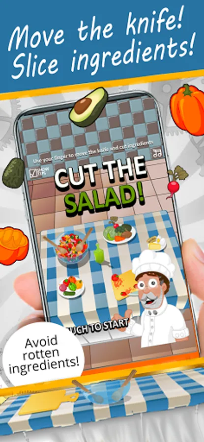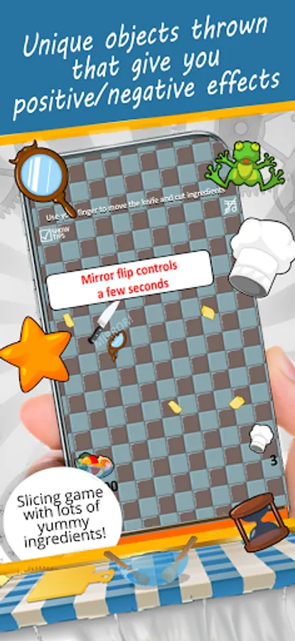 Move the knife, slice ingredients as they are thrown at the screen, and avoid rotten ingredients. There are also unique objects thrown that give you positive/negative effects.