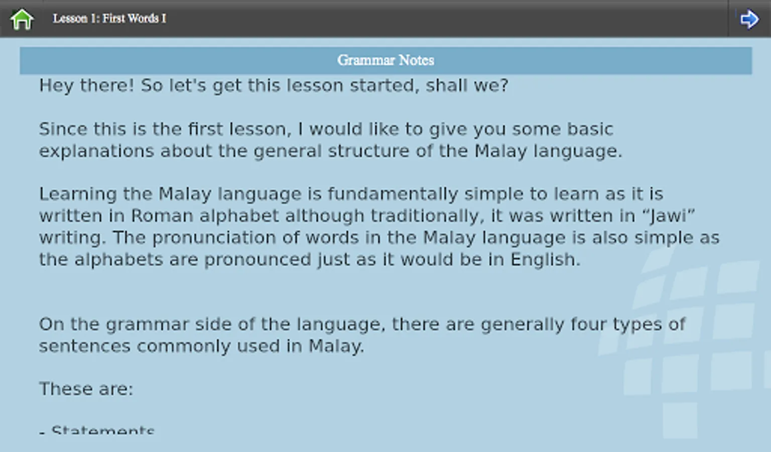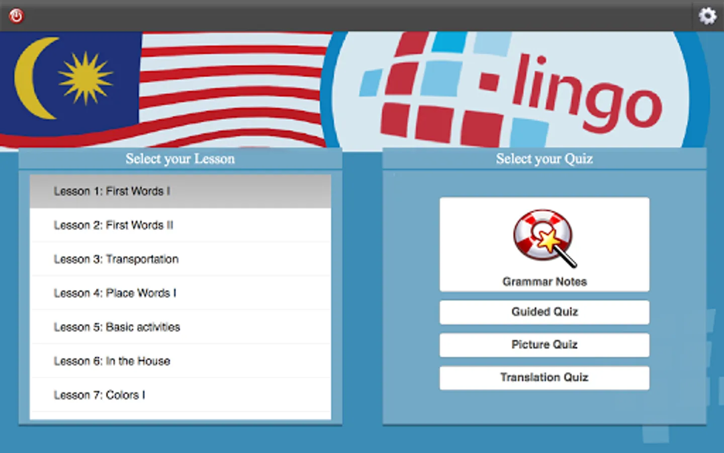 L-Lingo is designed to be easy to use. It exploits multimedia channels - words, recordings of native speech, and pictures - to enable you to grasp Malay words and phrases useful on the road, when mingling with Malay speakers, in day-to-day or family life, and when working.