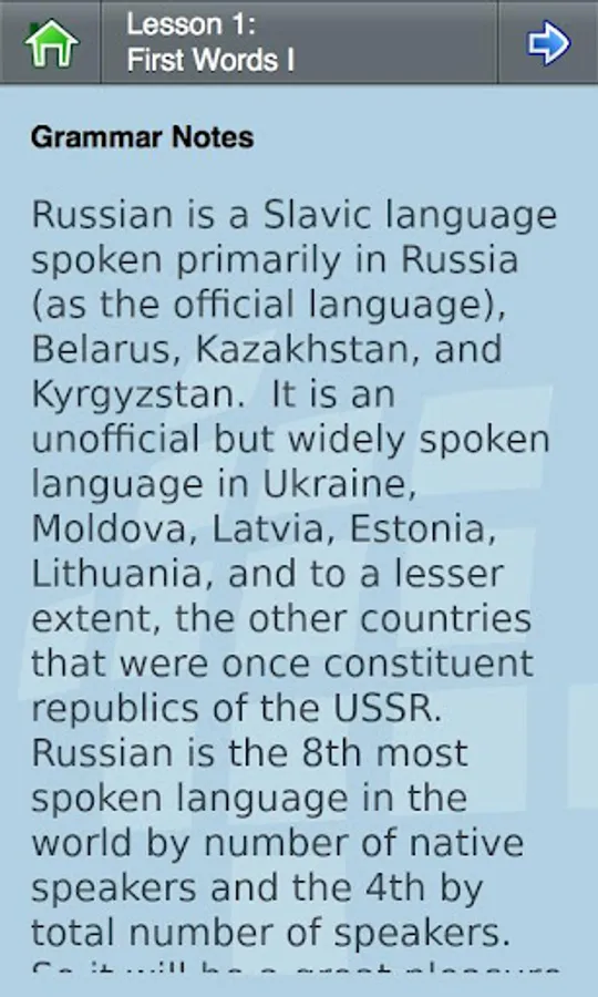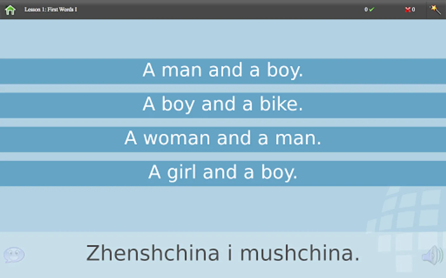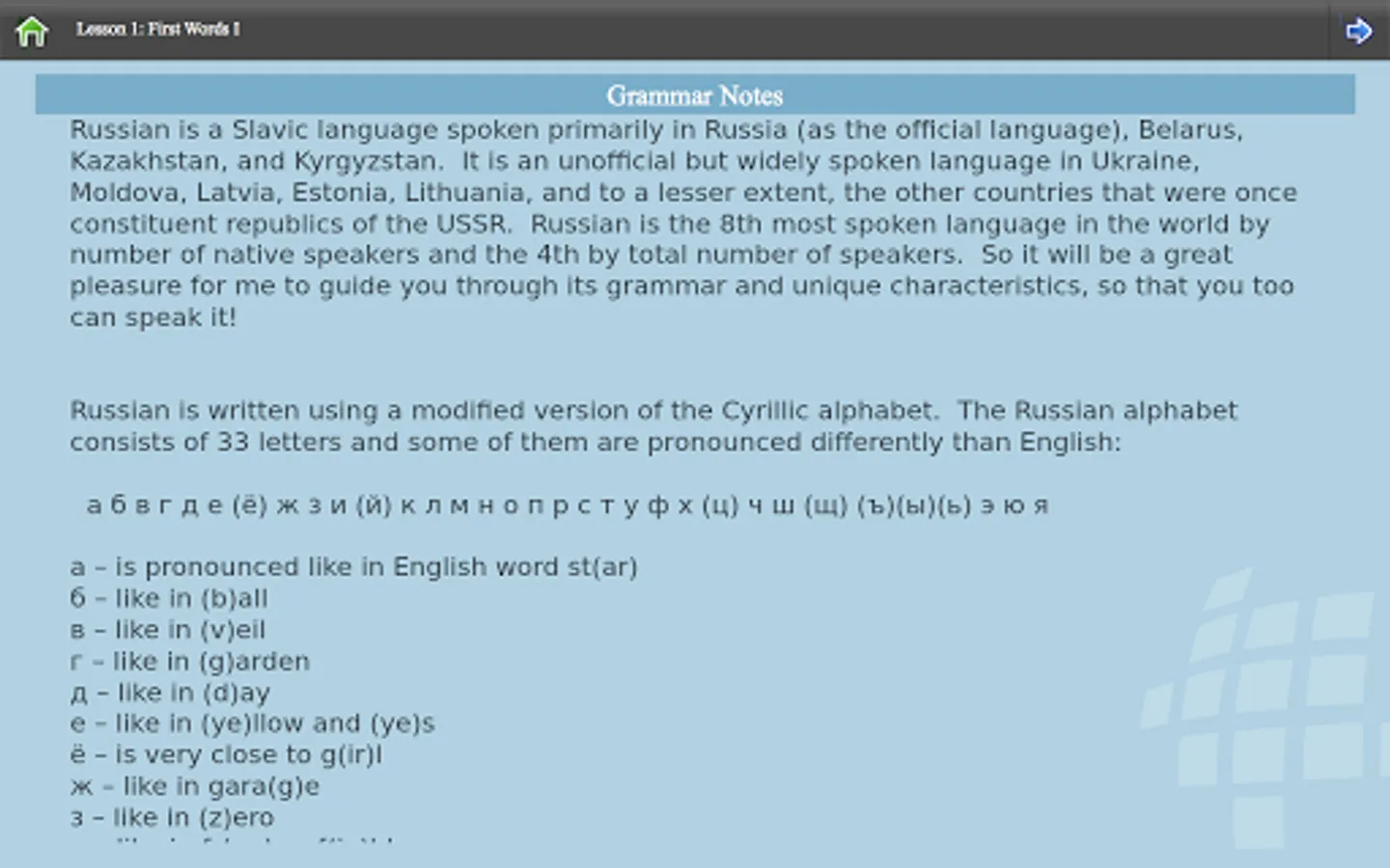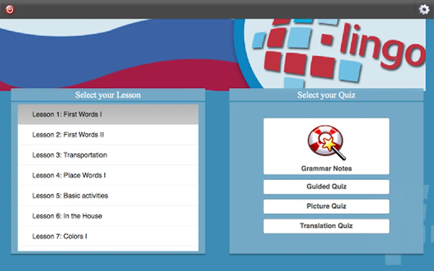 L-Lingo is designed to be easy to use. It exploits multimedia channels - words, recordings of native speech, and pictures - to enable you to grasp Russian words and phrases useful on the road, when mingling with Russian speakers, in day-to-day or family life, and when working.