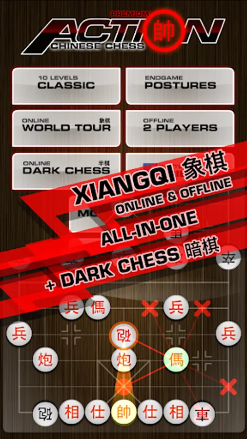 Action Chinese Chess Premium is the best Chinese Chess board game, aka Co Tuong (Cờ Tướng) or Xiangqi (象棋) in the market with amazing graphics, smart computer, awesome features and Ad-free.