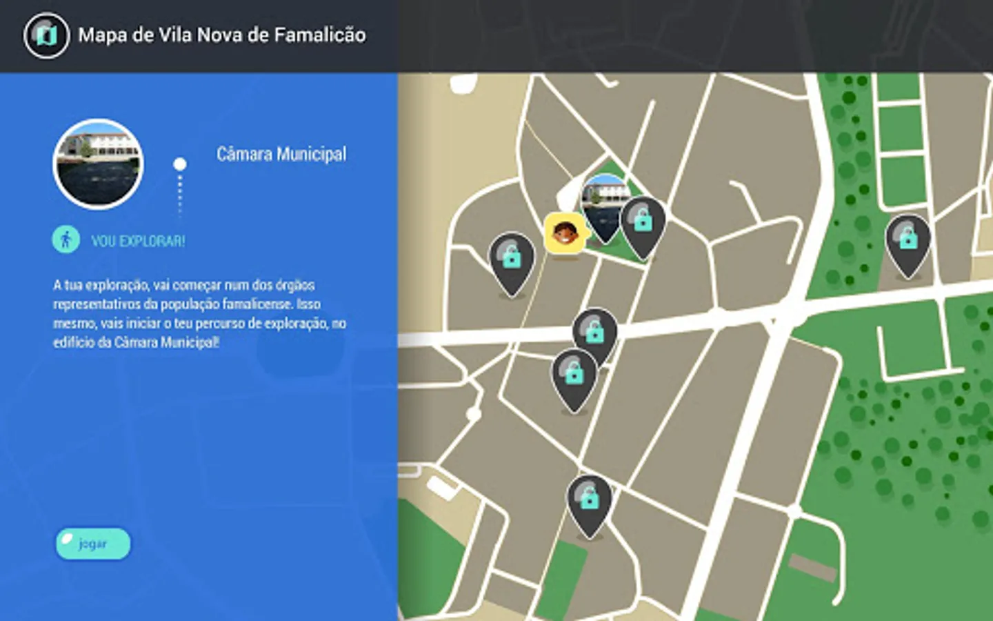 This application provides a map, with a predefined route, for children to travel through the historical center of Famalicão with their families. In this route are identified a set of places that children will explore and know through some puzzles.
