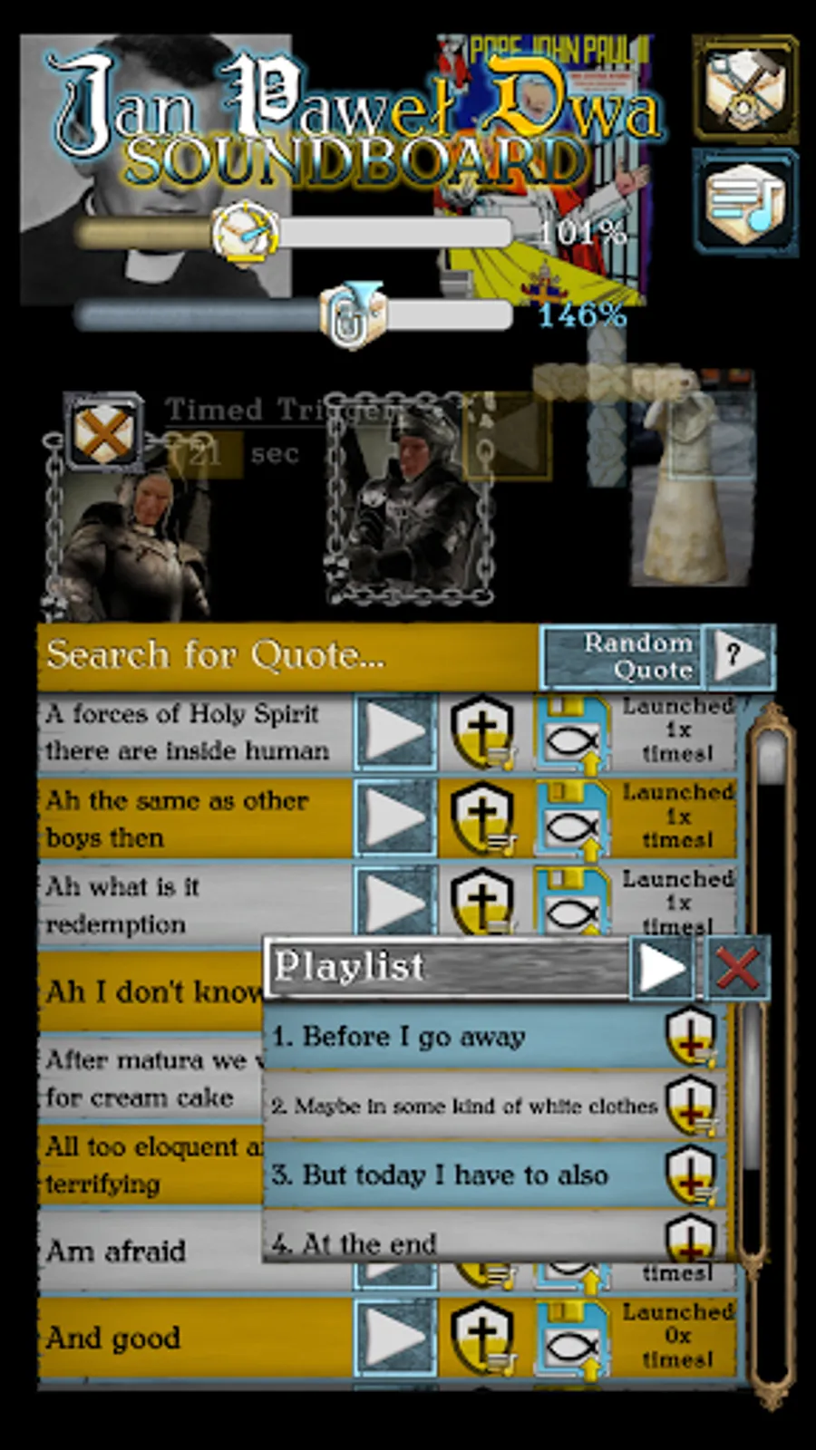 Become a master of JP2 and JP2GMD quotes! Speed up or slow down! Create a playlist! Find your favorite quote! Set the self-timer and enjoy the statements of Karol Wojtyła - the Holy Father John Paul II, the Great Pole, wherever you are! Infect others with the positive energy of the Pope's speech. Save your favorite quotes to your memory card and show off to your friends!