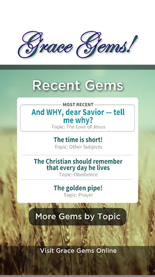 Receive daily notifications when new devotionals are posted! The complete database of "Gems" have been categorized by topic for quick reference and the main app screen displays the latest 4 "Gems", so you can easily catch up!