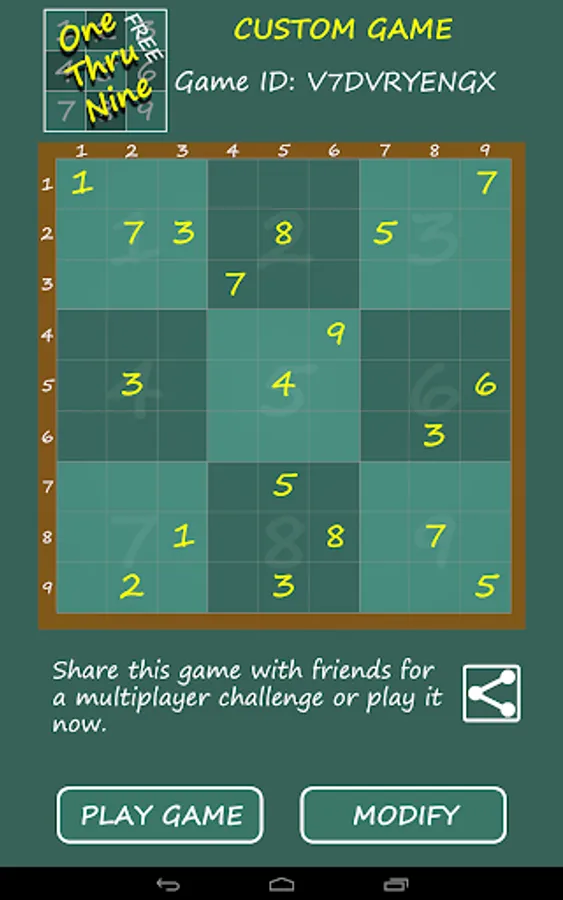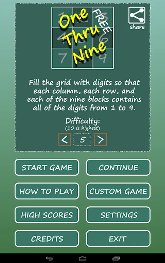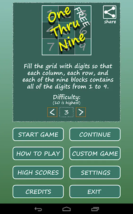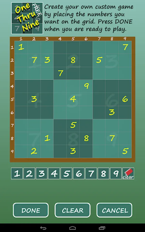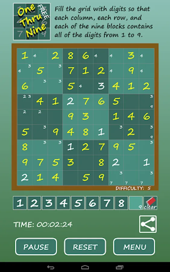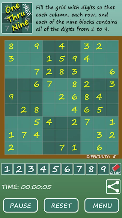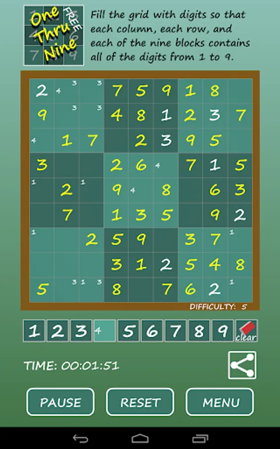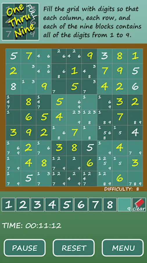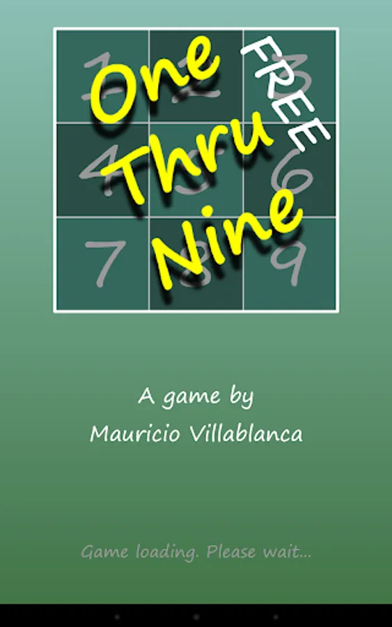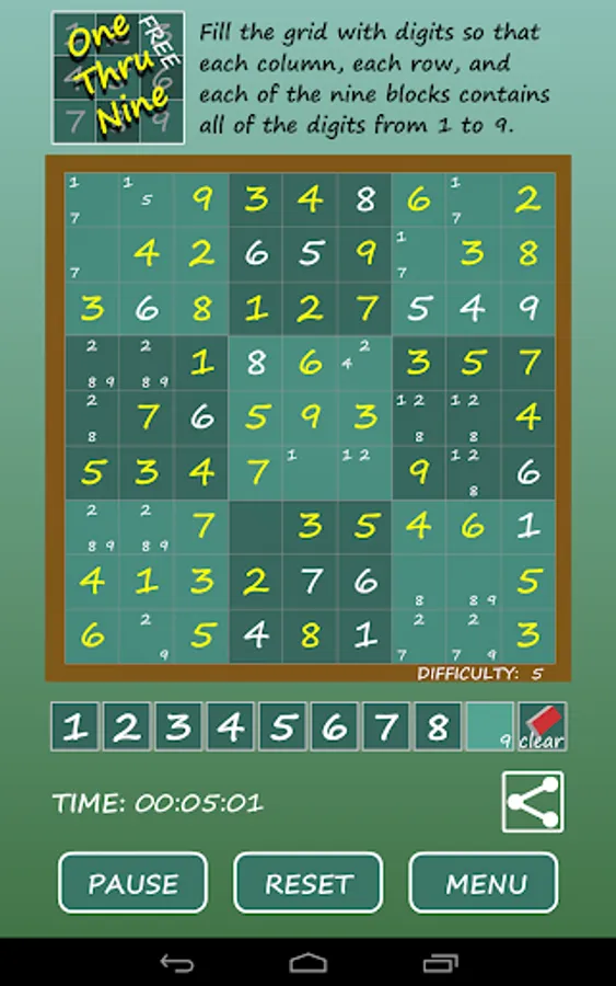 One Thru Nine is a puzzle game. Fill a 9x9 grid with digits from 1 to 9 so that every column, row and block has unique numbers.