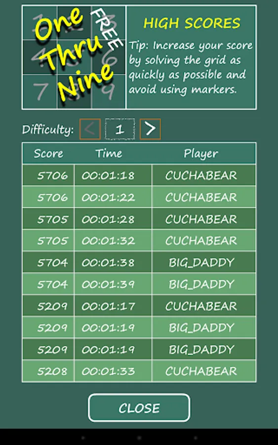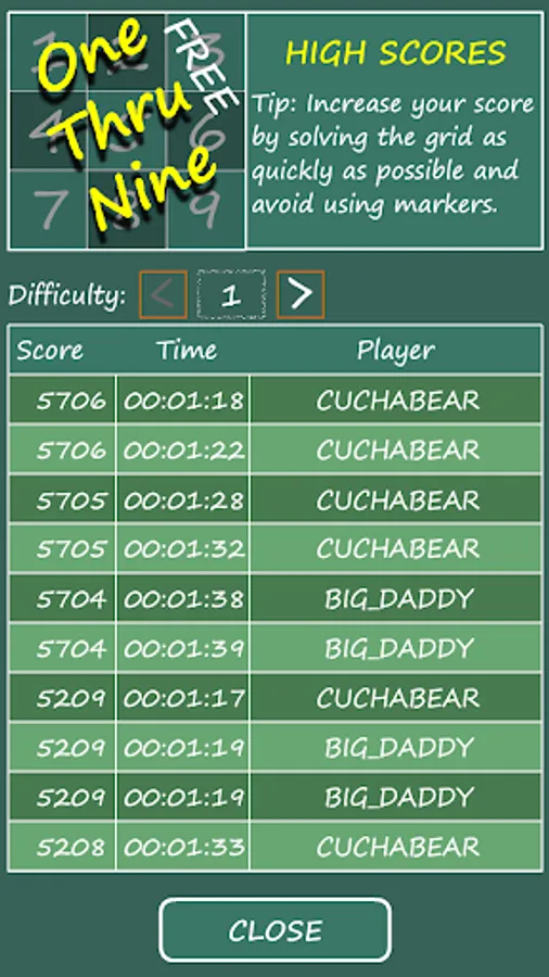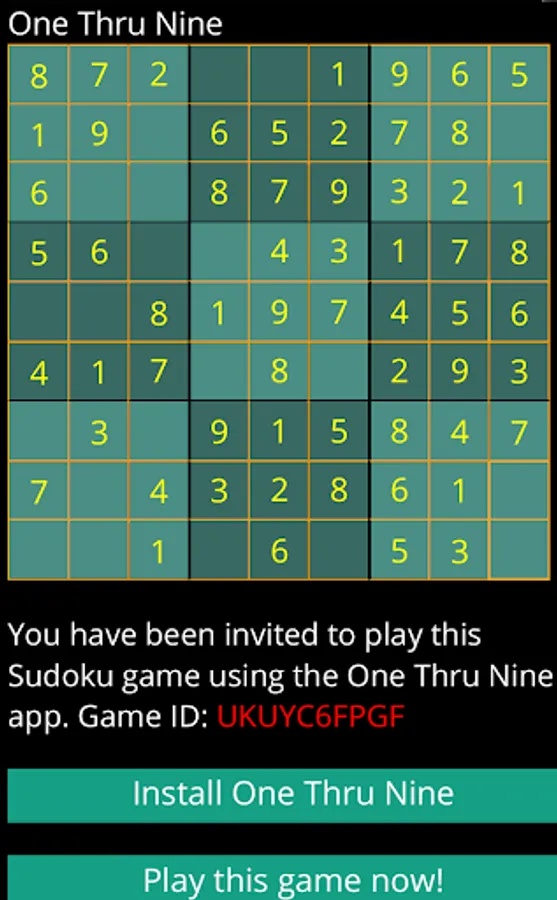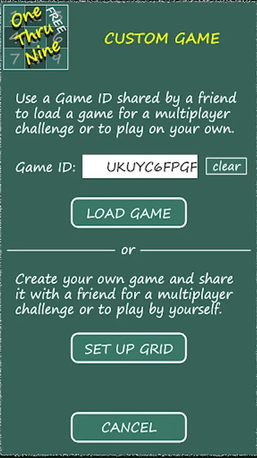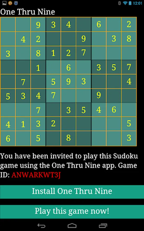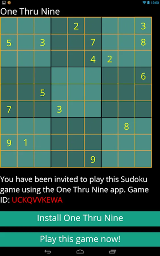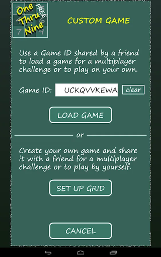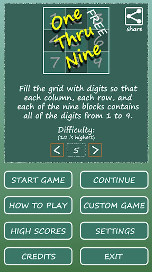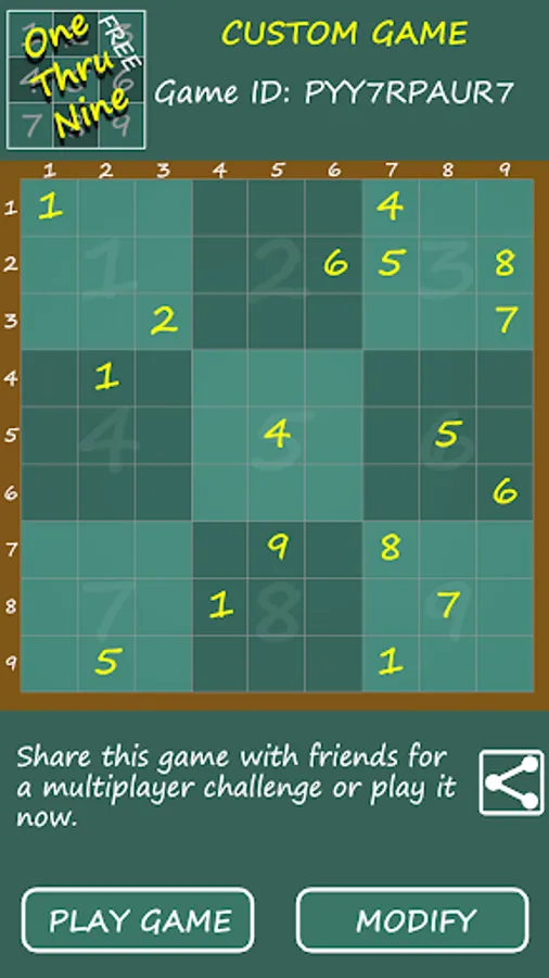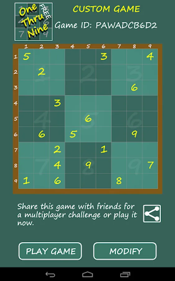 One Thru Nine is a puzzle game. Fill a 9x9 grid with digits from 1 to 9 so that every column, row and block has unique numbers.
