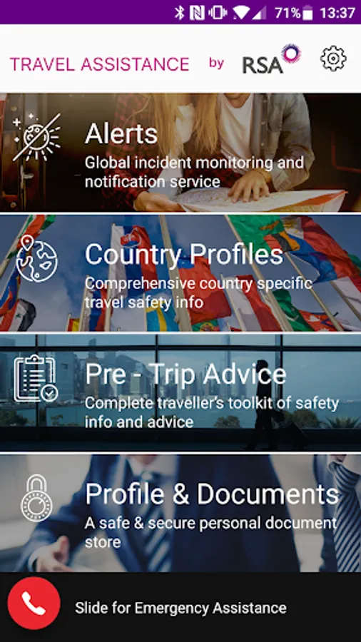 The RSA Travel Assistance App is your ultimate travel safety companion. Developed by leading security and medical experts it provides you with up to date travel information and advice and real time alerts on breaking news globally. The emergency mayday feature provides you with an email alert function to your emergency contact and a lifeline to specialist medical and security assistance 24 hours a day. In addition, view pre-trip advice and country profiles for comprehensive travel safety information, as well as a secure personal travel document storage.