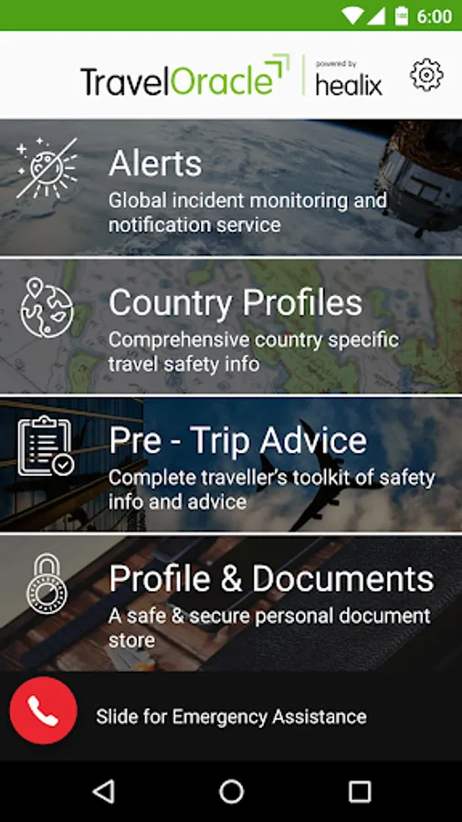 The Healix Travel Oracle App is your ultimate travel safety companion. Developed by leading security and medical experts it provides you with up to date travel information and advice and real time alerts on breaking news globally. The emergency mayday feature provides you with an email alert function to your emergency contact and a lifeline to specialist medical and security assistance 24 hours a day. In addition, view pre-trip advice and country profiles for comprehensive travel safety information, as well as a secure personal travel document storage.