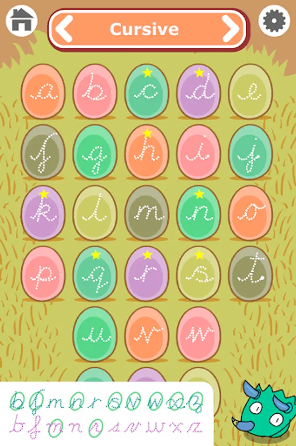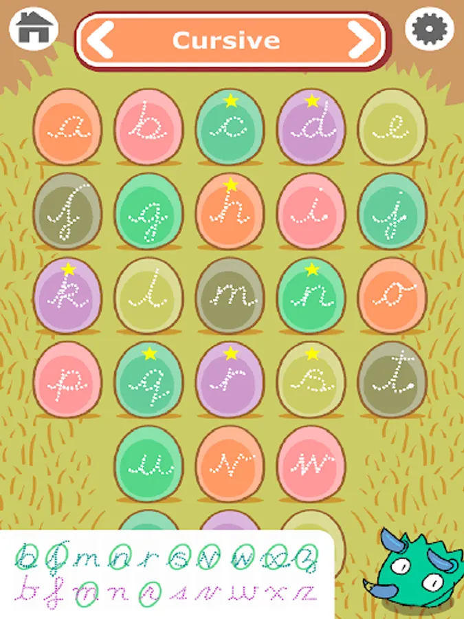 Completion of capital letters reveals a simple phonics based spelling game. Completion of either style of lower case letters is rewarded by a puzzle which reveals the Dinosaur inside the egg.