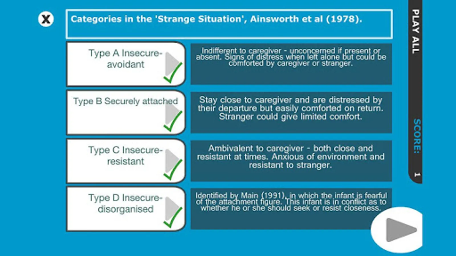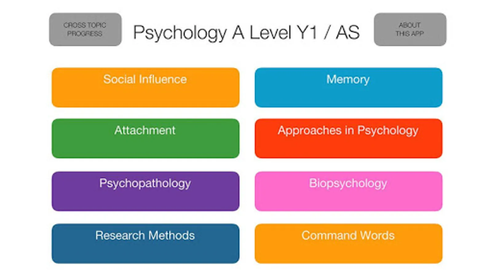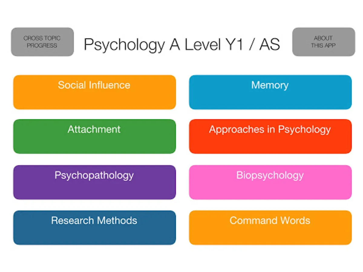 The Psychology Study App is designed for the NEW Psychology A Level, Y1 / AS exams starting 2016. Topics include; Social Influence, Memory, Attachment, Psychopathology, Approaches in Psychology, Biopsychology, Research Methods and Command Words.