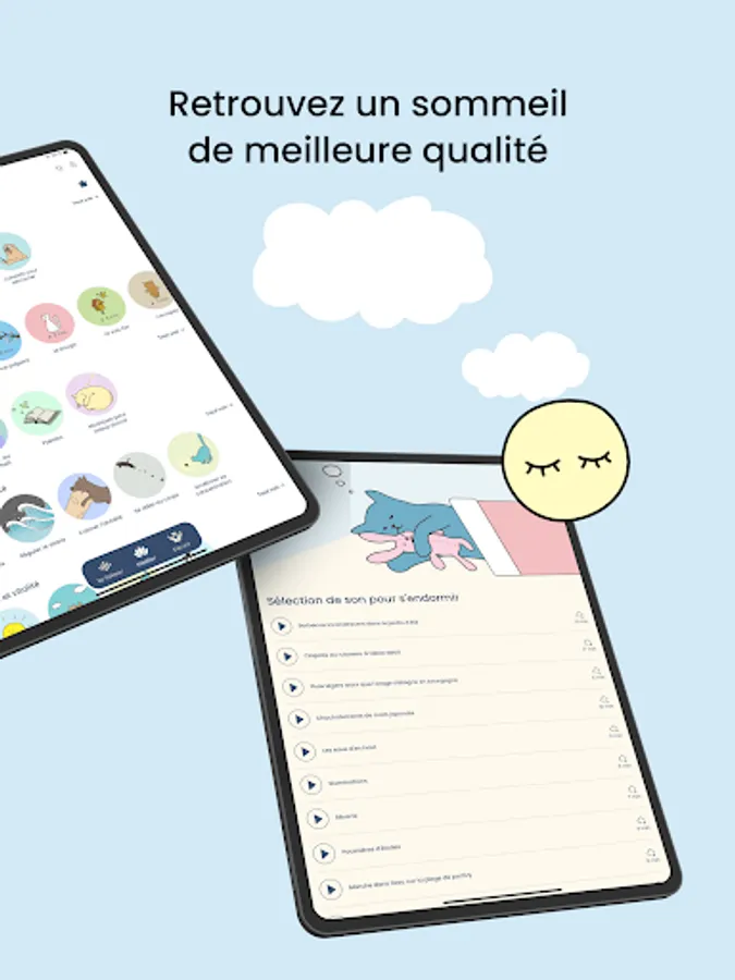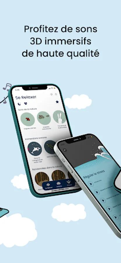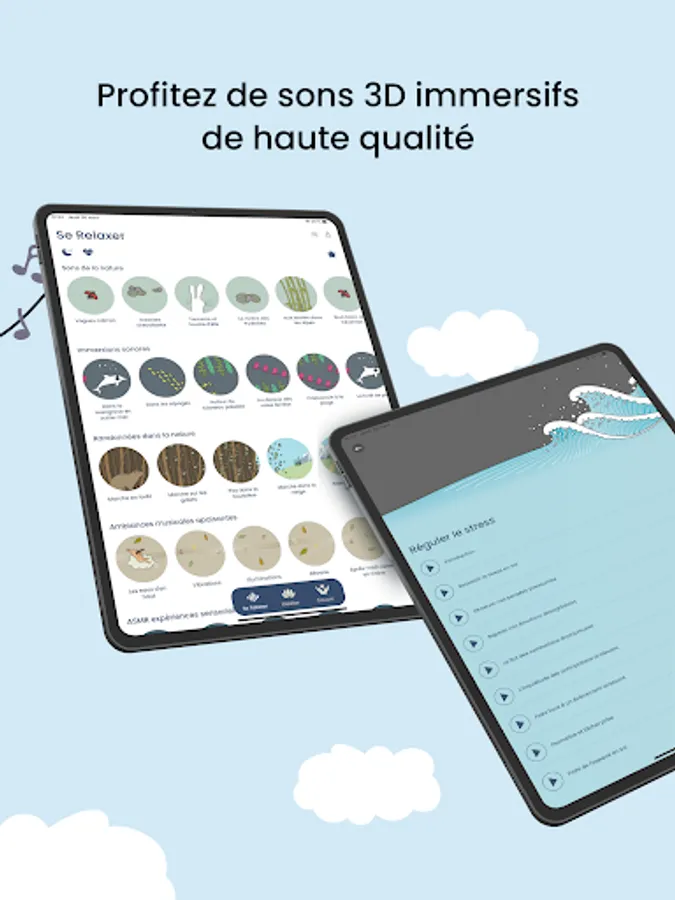 In addition to meditations, the application includes a sophrology, relaxation section with numerous authentic and exclusive immersive audio content (sounds of nature, immersions and soundscapes, relaxing music produced by a music therapist, ASMR sounds, etc.).