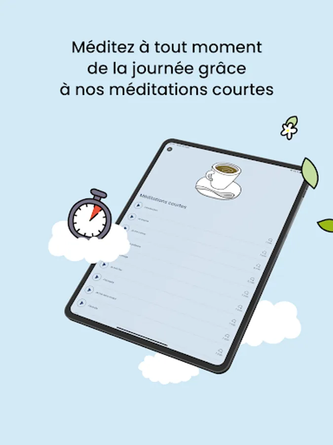 You will find within the application a variety of short meditations, according to different themes and flexible according to the time you have: 5, 10, 20 min according to your possibilities.