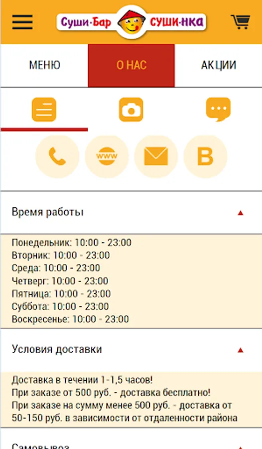 Delivery of rolls, sushi, pizza! Delivery within 1-1.5 hours! When ordering from 500 rub.- Free Shipping! At the order of less than 500 rub.- delivery of 50-150 rubles. depending on the remoteness of the area! from 10:00 to 23:00 every day without breaks and weekends! Chance of reservation!
