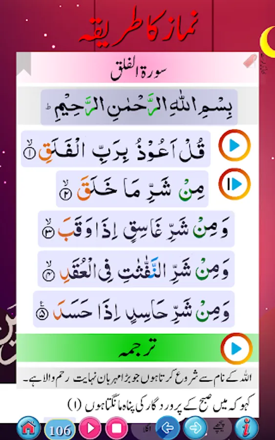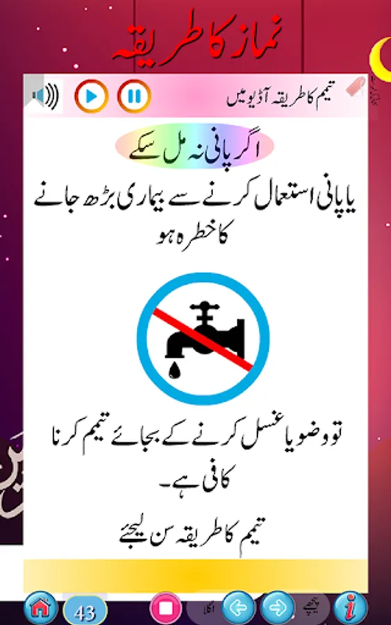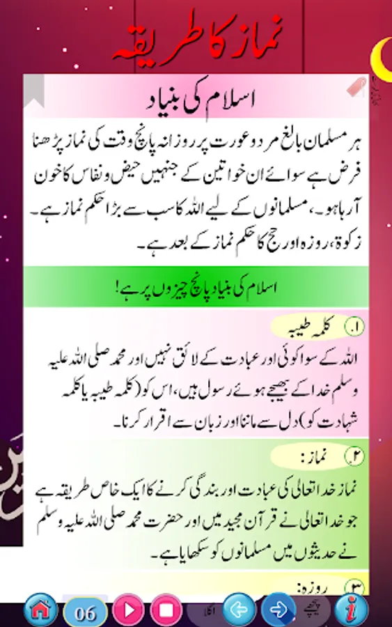 نمازکی ادائیگی کے لیے ایک بہترین ایپ۔ اس ایپ کے اندر عربی عبارات آواز کے ساتھ شامل ہیں۔ یہ ایپ نماز کی درست ادائیگی کے طریقہ کار کو بہترین انداز سے بیان کرتی ہے۔ ایپ کے مندرجات حافظ عبدالباسط اور قاری محمد طاہربشیر نے کیے ہیں۔