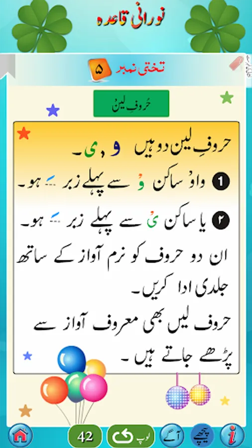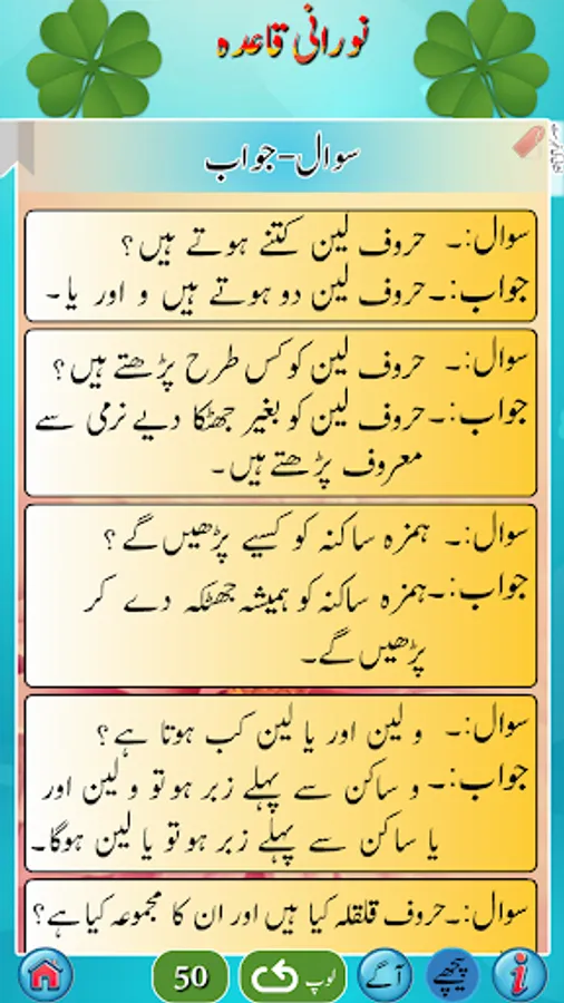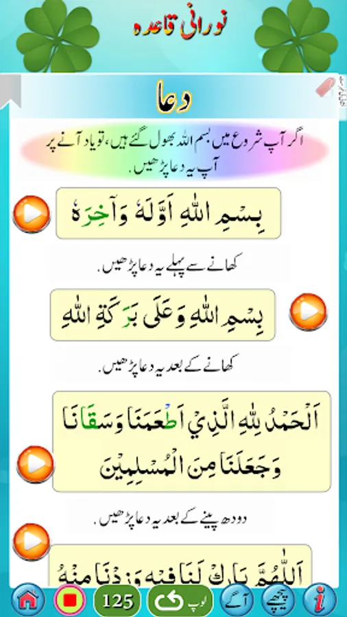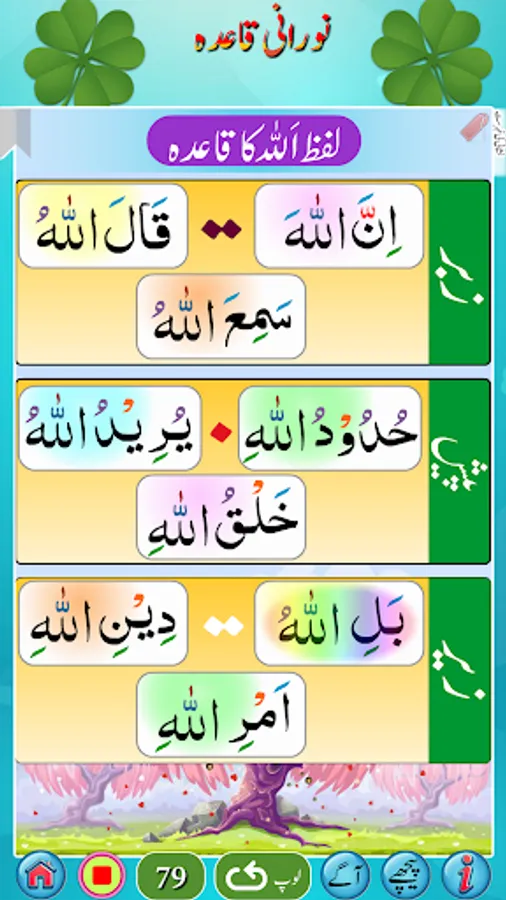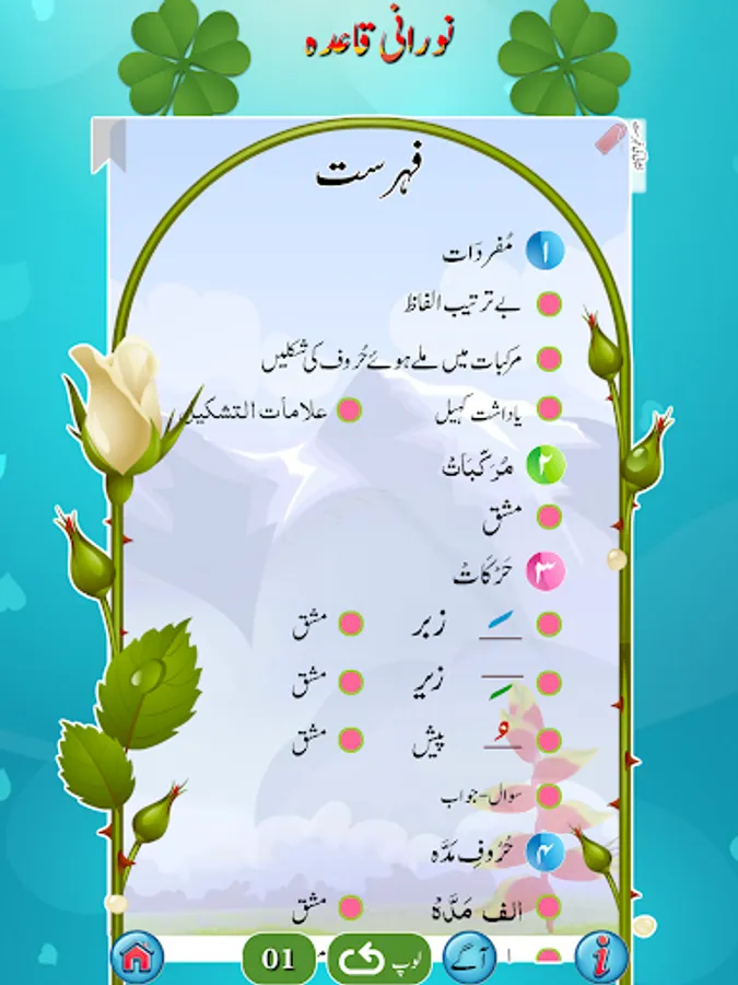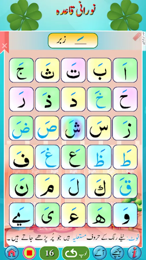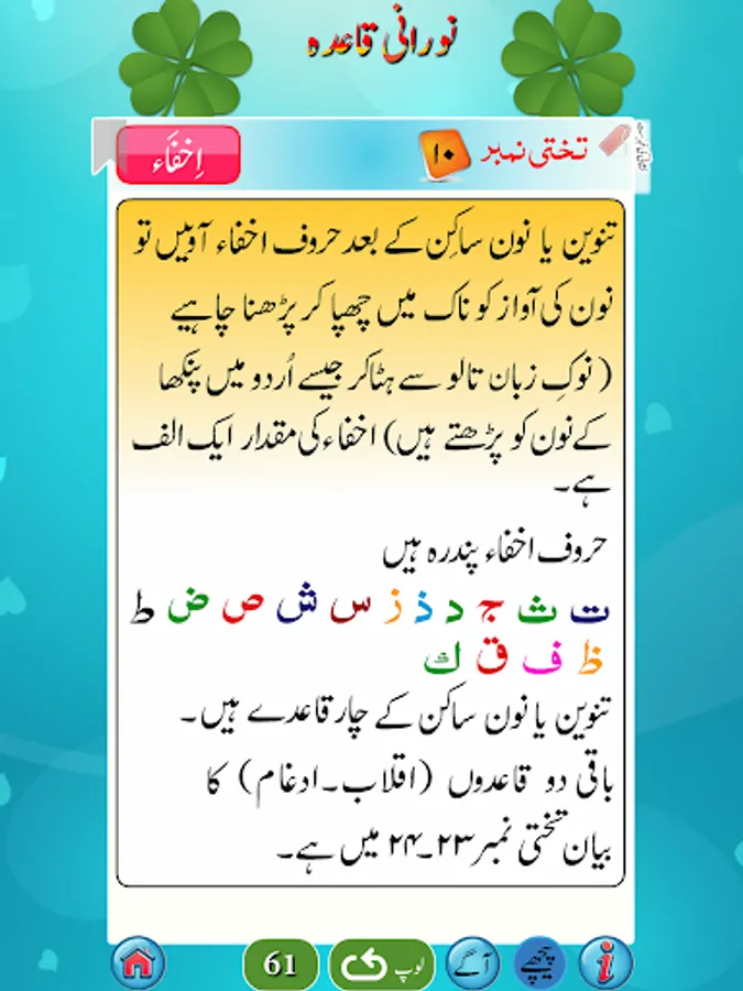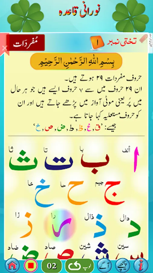 استاد کی مدد کے بغیر نورانی قاعدہ سیکھئے۔ روزانہ صرف ایک گھنٹہ دیجئے اور اس کو سیکھئے۔ قرآن پاک کو شروع سے پڑھنا سیکھنے کیلئے سب سے پہلے نورانی قاعدہ سمجھنا پڑتا ہے۔ یہ ان لوگوں کیلئے ہے جو اُردو جانتے ہیں۔ اگر کوئی شخص عربی سیکھنے کا خواہشمند ہوتو وہ عربی کے بنیادی الفاظ سیکھنے کیلئے بھی اس کو استعمال کرسکتاہے۔صرف صفحات کو اسکرول کریں اور کِلک کریں اور سُنیں۔ اس میں ہر لفظ کیلئے آواز موجود ہے۔ اس میں 27 ابواب ہیں۔