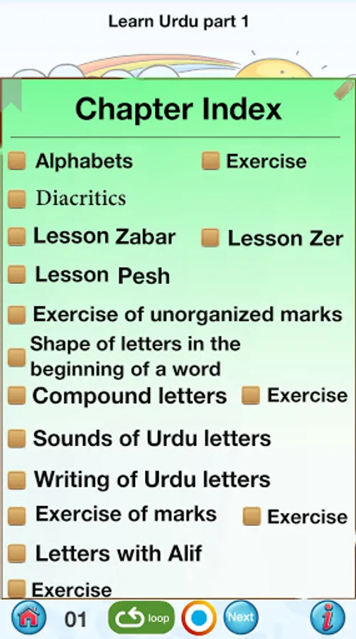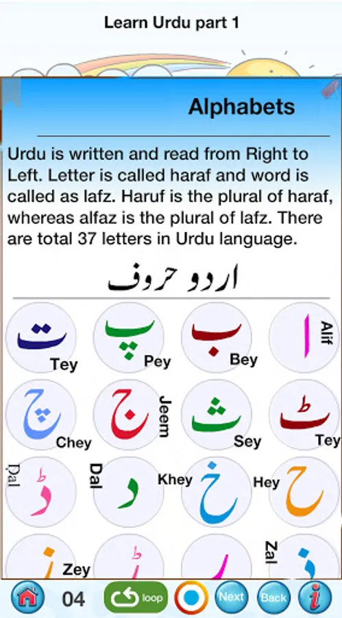 Clear pictures with clear audio are provided for all Urdu words. The app contains fun graphics which are both memorable and colorful.