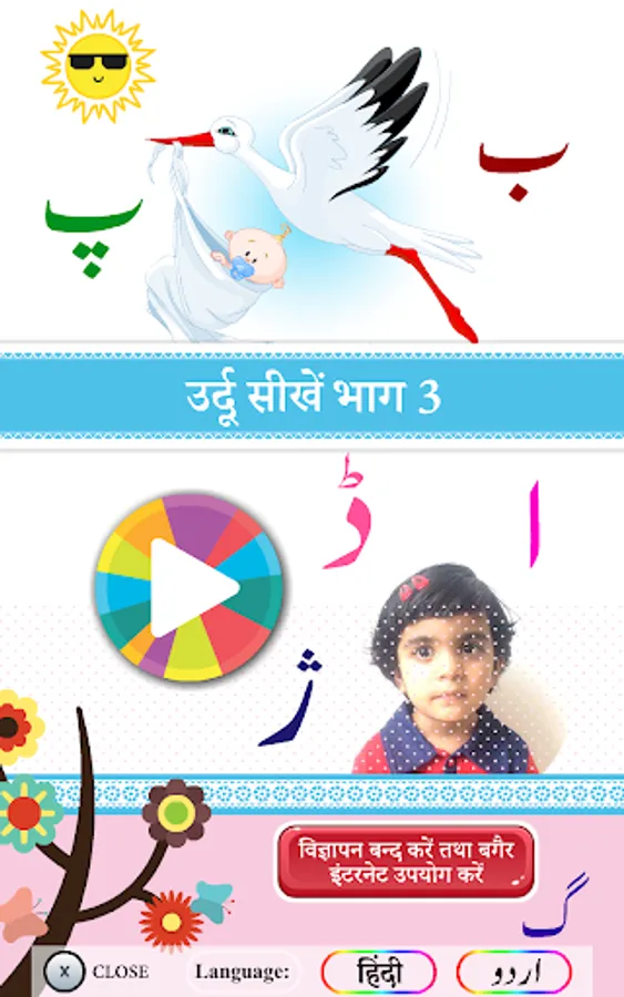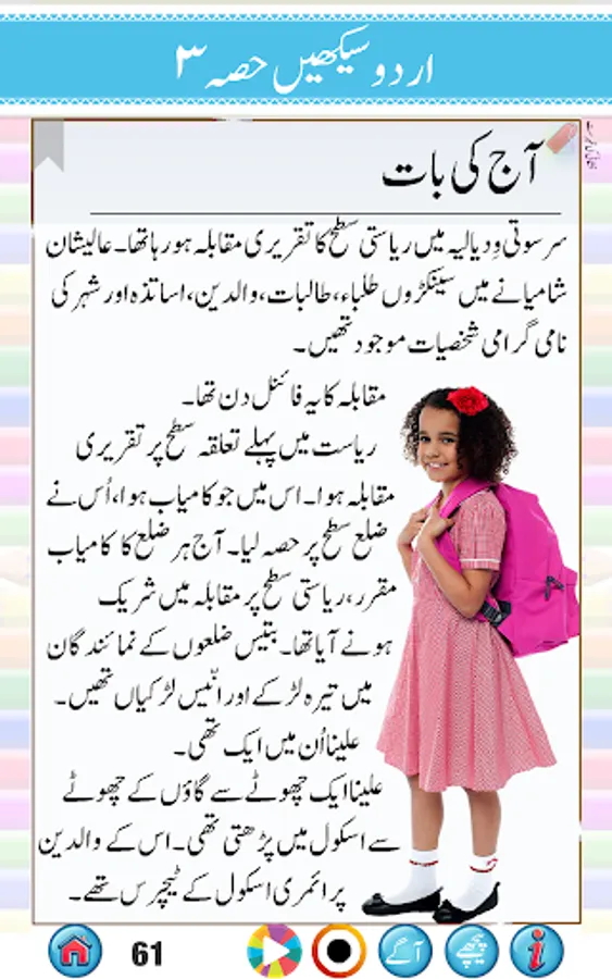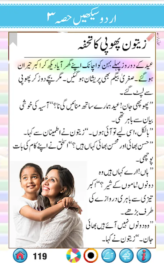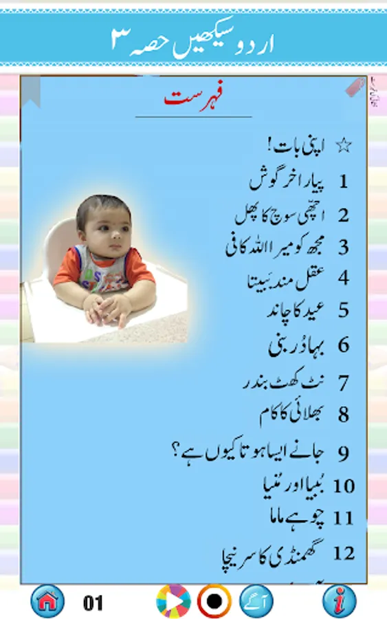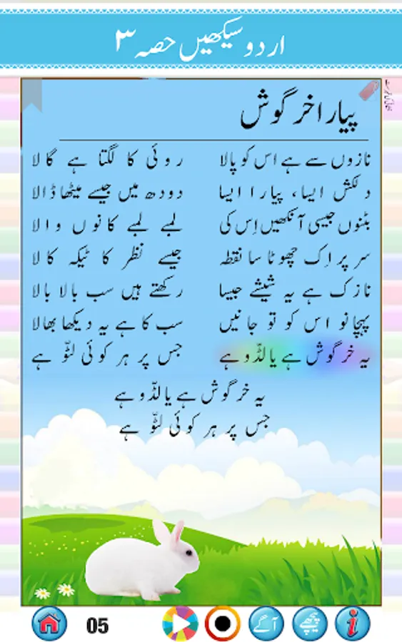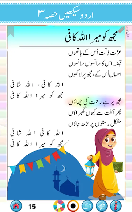 Urdu Qaida Part 3 has poems and stories with audio to learn Urdu reading.