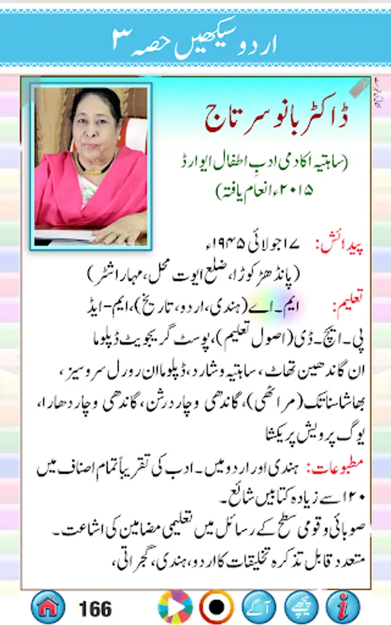 Learn Urdu reading from the poems and stories of Dr. Bano Sartaj. Sound is added for each page. (उर्दू सीखें)